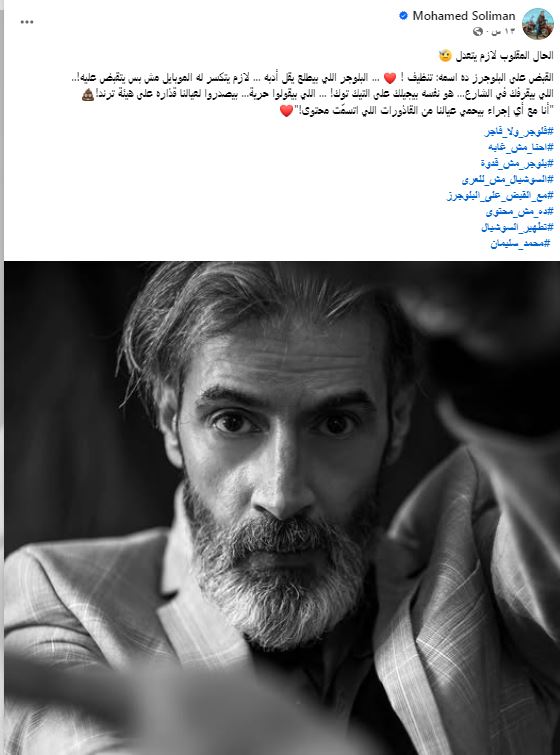 وكتب محمد سليمان عبر صفحته الرسمية "فيس بوك"" الحال المقلوب لازم يتعدل ، القبض على البلوجرز ده اسمه: تنظيف ! البلوجر اللي بيطلع يقل أدبه ،لازم يتكسر له الموبايل مش بس يتقبض عليه!".