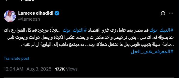 وكتبت الإعلامية لميس الحديدي عبر صفحتها الرسمية علي موقع "إكس" تويتر سابقآ " التيك توك فى مصر بقى عامل زى غزو اقتصاد التوك توك ، فجأة موجود فى كل الشوارع ،اى حد يسوقه فى اى سن ، بدون ترخيص واخد مخدرات و يمشى عكس الاتجاه و يعمل حوادث و يموت ناس ..حاجة سهلة بتجيب فلوس بدل ما نشتغل شغلانه بجد .. ده مجتمع ذاهب إلى الهاوية ان لم ننتبه .
