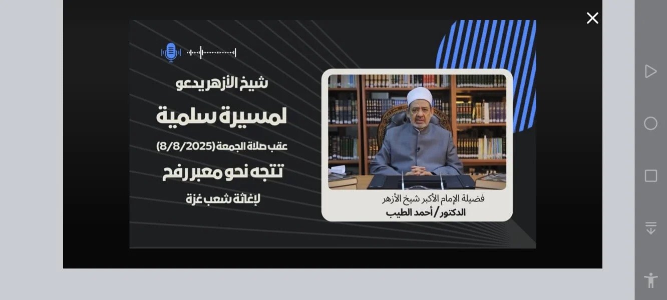 وكان قد انتشر فيديو عن طريق الذكاء الاصطناعى لفضيلة الإمام الأكبر أ.د أحمد الطيب، شيخ الأزهر، يدعو فيه الي مسيرات سليمة تخرج من المساجد يوم الجمعة القادمة لنصرة غزة .
