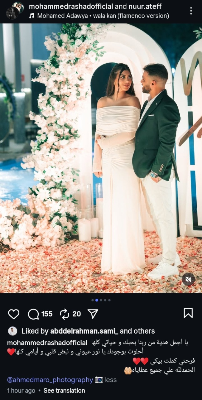 اعلن المطرب محمد رشاد ارتباطه بفتاة من خارج الوسط الفني ، واحتفل بطريقته الخاصة بجلسة تصوير عبر صفحته الرسمية انستجرام" قائلا " يا اجمل هدية من ربنا بحبك، وحياتي كلها احلوت بوجودك ، يا نور عيوني ونبض قلبي ، وايامي كلها ، فرحتي كملت بيكي ، الحمدلله علي جميع عطاياة ".