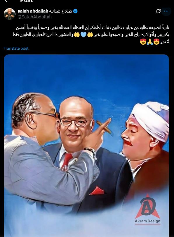 طمأن النجم الكبير صلاح عبدالله جمهوره ومحبيه على حالته الصحية وجاء ذلك عبر منشور له علي حسابه الرسمي على موقع "إكس" "تويتر سابقآ وكتب "تلبيةً لنصيحة غالية من حبايب غاليين دخلت أطمنكم إن العبد الله الحمدلله بخير وصحياً ونفسياً احسن بكتيييير واقولكم صباح الخير وتصبحوا على خير المنشور دا لمين؟لحبايبي الطيبين فقط لاغير".