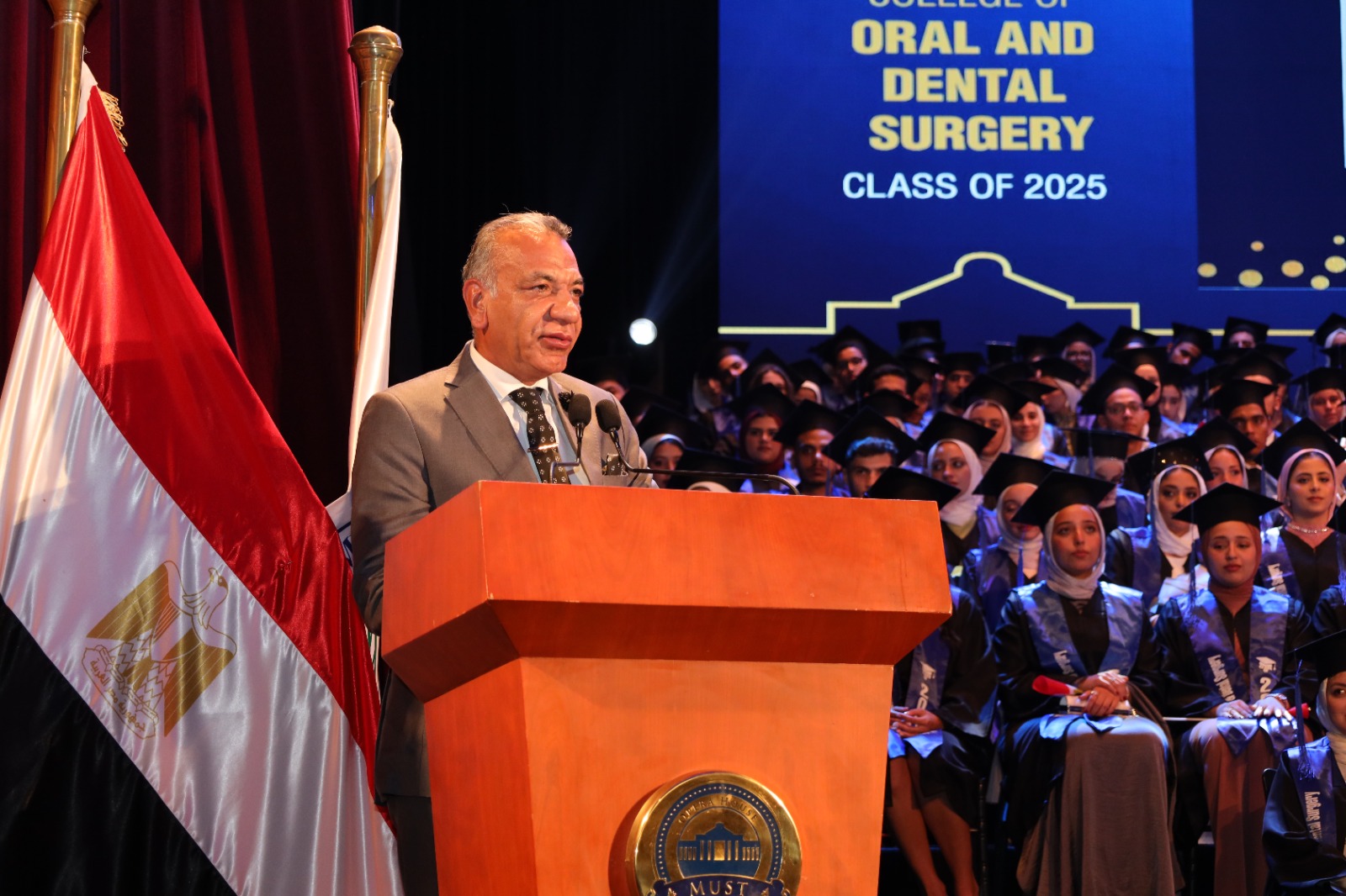 وأعرب الدكتور نهاد المحبوب القائم بأعمال رئيس جامعة مصر للعلوم والتكنولوجيا عن فخره بتخريج هذه الدفعة من كلية طب الأسنان، مؤكدا أن الكلية تُعد من أبرز الكليات في الجامعة، وقال مخاطبا الخريجين: "لقد بذلتم جهدا كبيرا في سبيل الوصول إلى هذه اللحظة، واليوم أنتم على أعتاب حياة مهنية تتطلب منكم الالتزام، والرحمة، والحرص على التعلم المستمر. أنتم سفراء لجامعتكم في كل مكان، فكونوا على قدر المسؤولية، واصنعوا فرقًا حقيقيًا في حياة الناس".