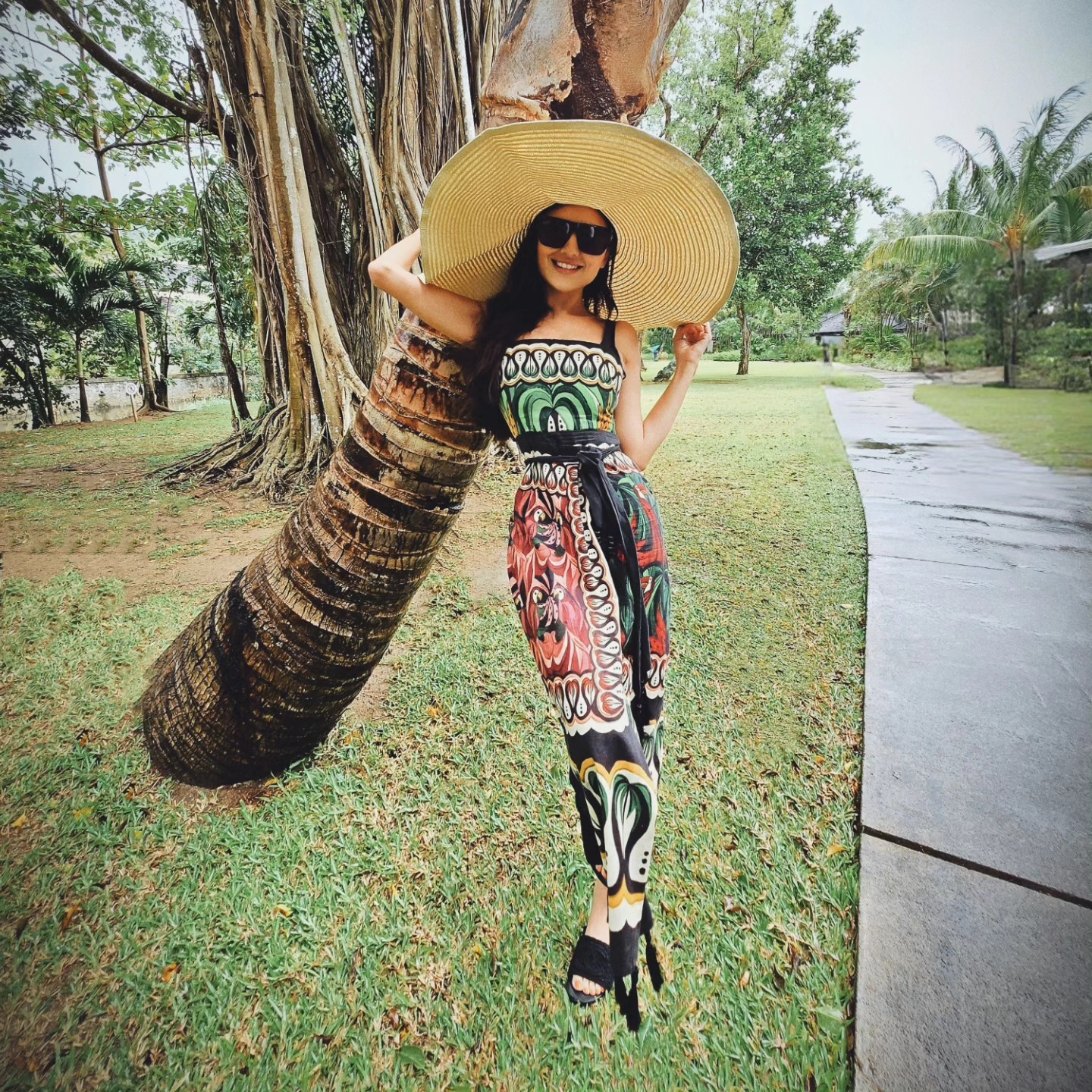 اختارت مي فستان ماكسي طويل بتصميم استوائي نابض بالحياة، يتميز بطبعات غنية بالألوان المستوحاة من الطبيعة، أبرزها الأحمر، الأخضر، والأسود. الفستان جاء بقصة ضيقة من الأعلى مع حزام خصر أسود عريض أبرز رشاقة قوامها، كما أن الخامة الخفيفة للفستان أضفت على الإطلالة لمسة من الحيوية والانتعاش.
