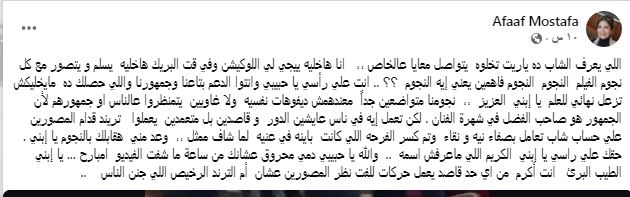 وكتبت عفاف عبر صفحته الشخصية علي موقع التواصل الاجتماعي "فيس بوك" " اللي يعرف الشاب ده ياريت تخلوه يتواصل معايا عالخاص ،، انا هخليه ييجي لي اللوكيشن وفي قت البريك هخليه يسلم و يتصور مع كل نجوم الفيلم النجوم النجوم فاهمين يعني إيه النجوم ؟؟ .. انت علي رأسي يا حبيبي وانتوا الدعم بتاعنا وجمهورنا واللي حصلك ده مايخليش تزعل نهائي للعلم يا إبني العزيز".