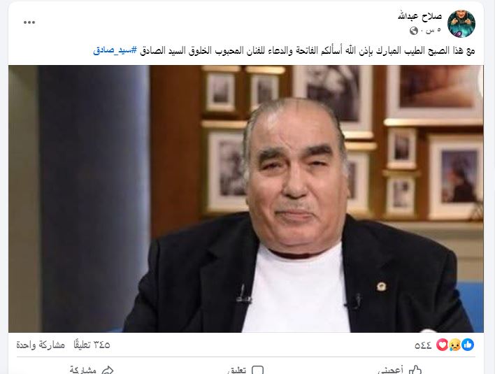 وكتب صلاح عبدالله عبر صفحته الرسمية "فيس بوك"" مع هذا الصبح الطيب المبارك بإذن الله أسألكم الفاتحة والدعاء للفنان المحبوب الخلوق السيد الصادق سيد صادق".