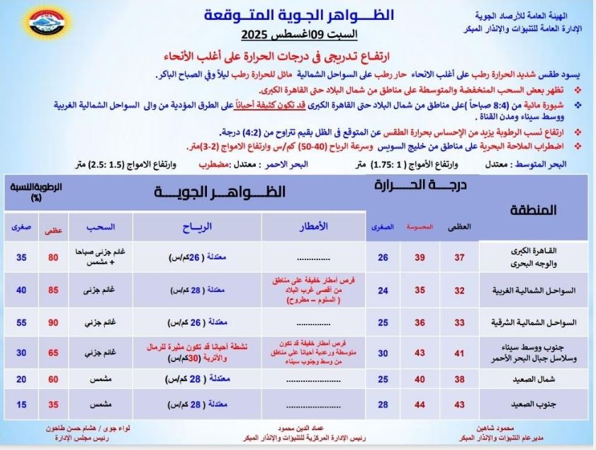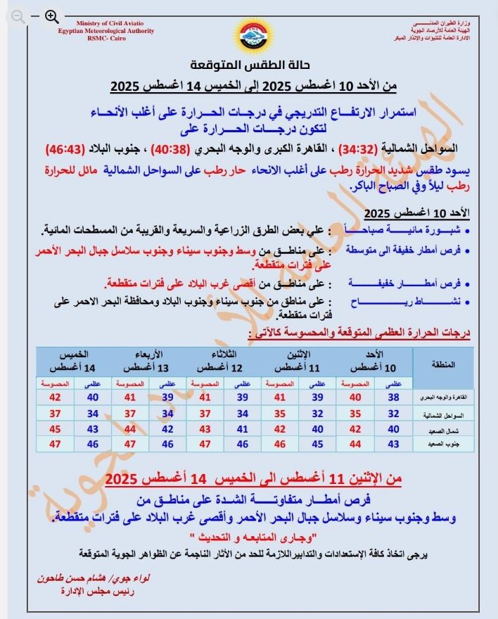 كما وأكدت هيئة الأرصاد أن الارتفاع التدريجي لدرجات الحرارة يبدأ من السبت 9 أغسطس 2025 ونشرت توقعات الطقس الايام القادمة حتي يوم 14 أغسطس وهي كالتالي :