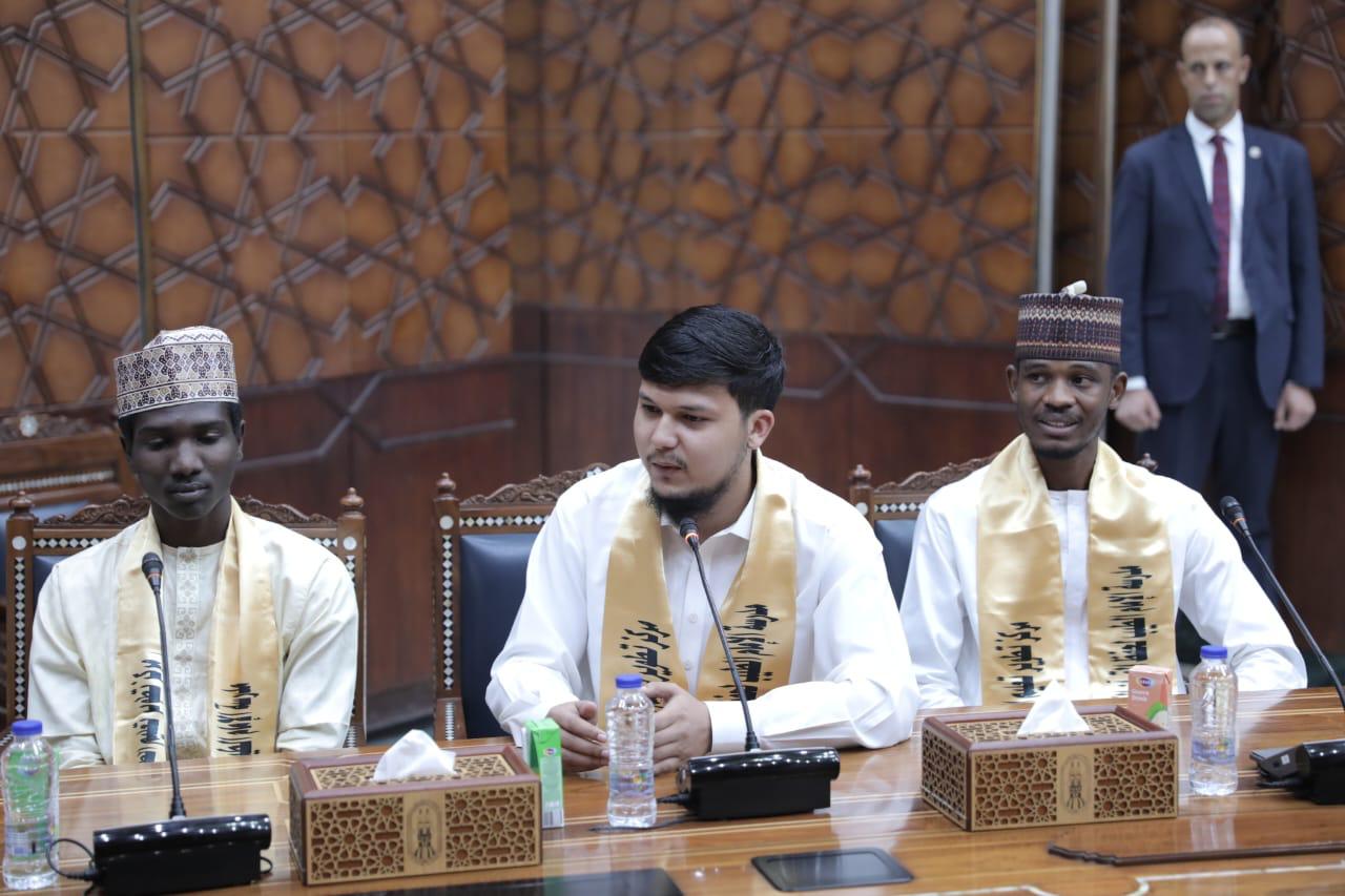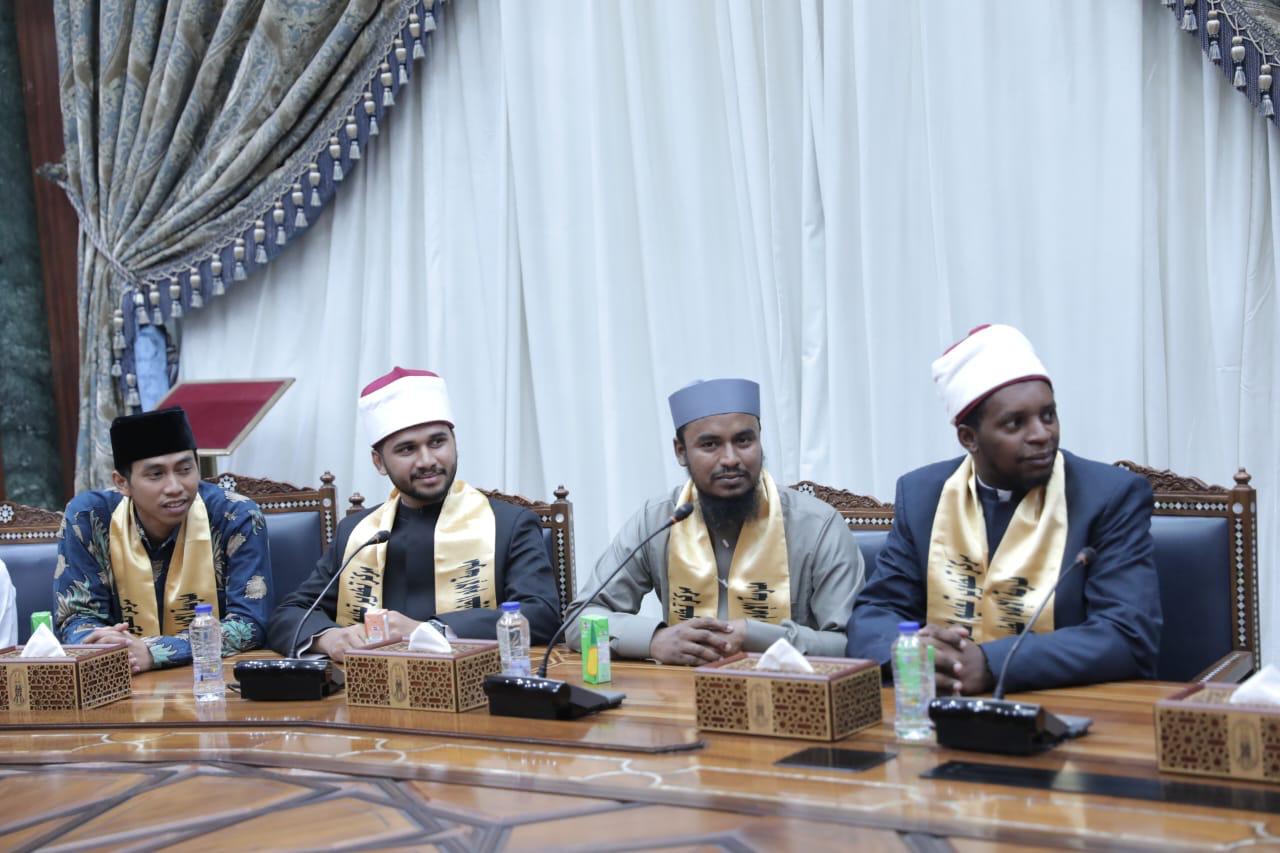 ورحب شيخ الأزهر بأبنائه الطلاب، معربًا عن سعادته باستقبال حفظة كتاب الله، مؤكدًا حرص الأزهر الشريف على تعليم القرآن الكريم ونشر علومه، وإتاحة فرصة الدراسة الحرة لحفظ القرآن الكريم والتفقه في علومه وضبط التلاوة للطلاب الوافدين، ومساعدتهم في تعلم النطق الصحيح لآيات كتاب الله، وتعليم التجويد وأحكام التلاوة، بجانب نشر المنهج الأزهري الوسطي المعتدل.