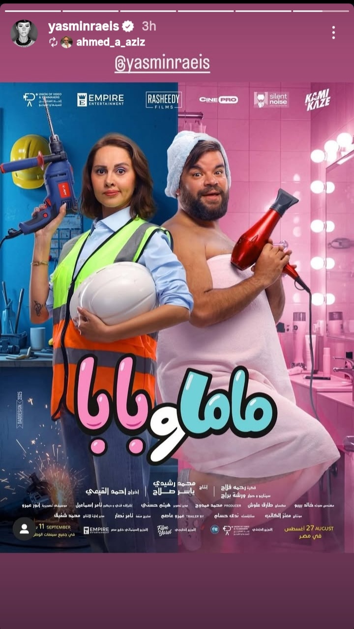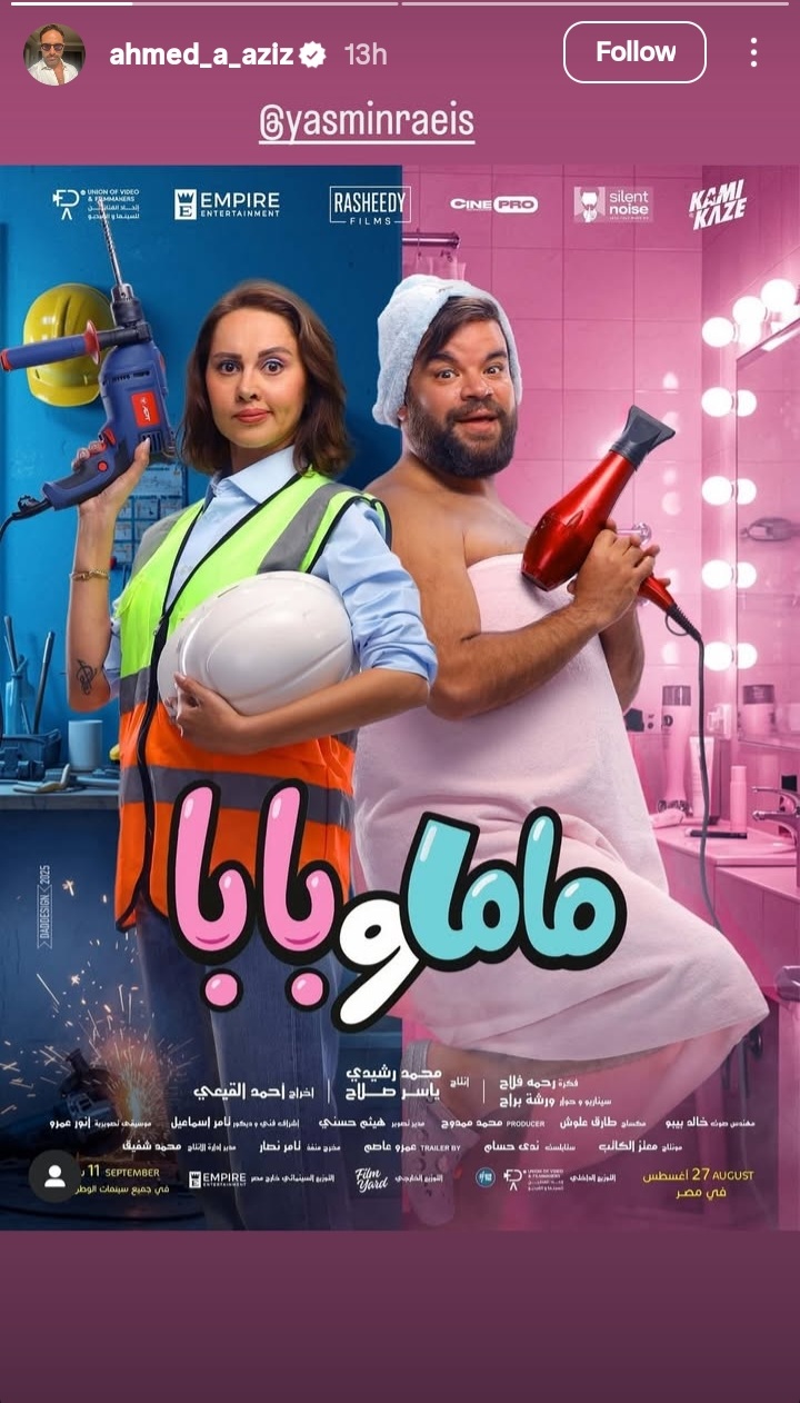 ونشر أحمد عبد العزيز عبر خاصية "الاستوري " على صفحته الرسمية "إنستجرام" البوستر الرسمي لفيلم "ماما وبابا" الذي تقوم ببطولته زوجته الفنانة ياسمين رئيس في إشارة دعم لها .
