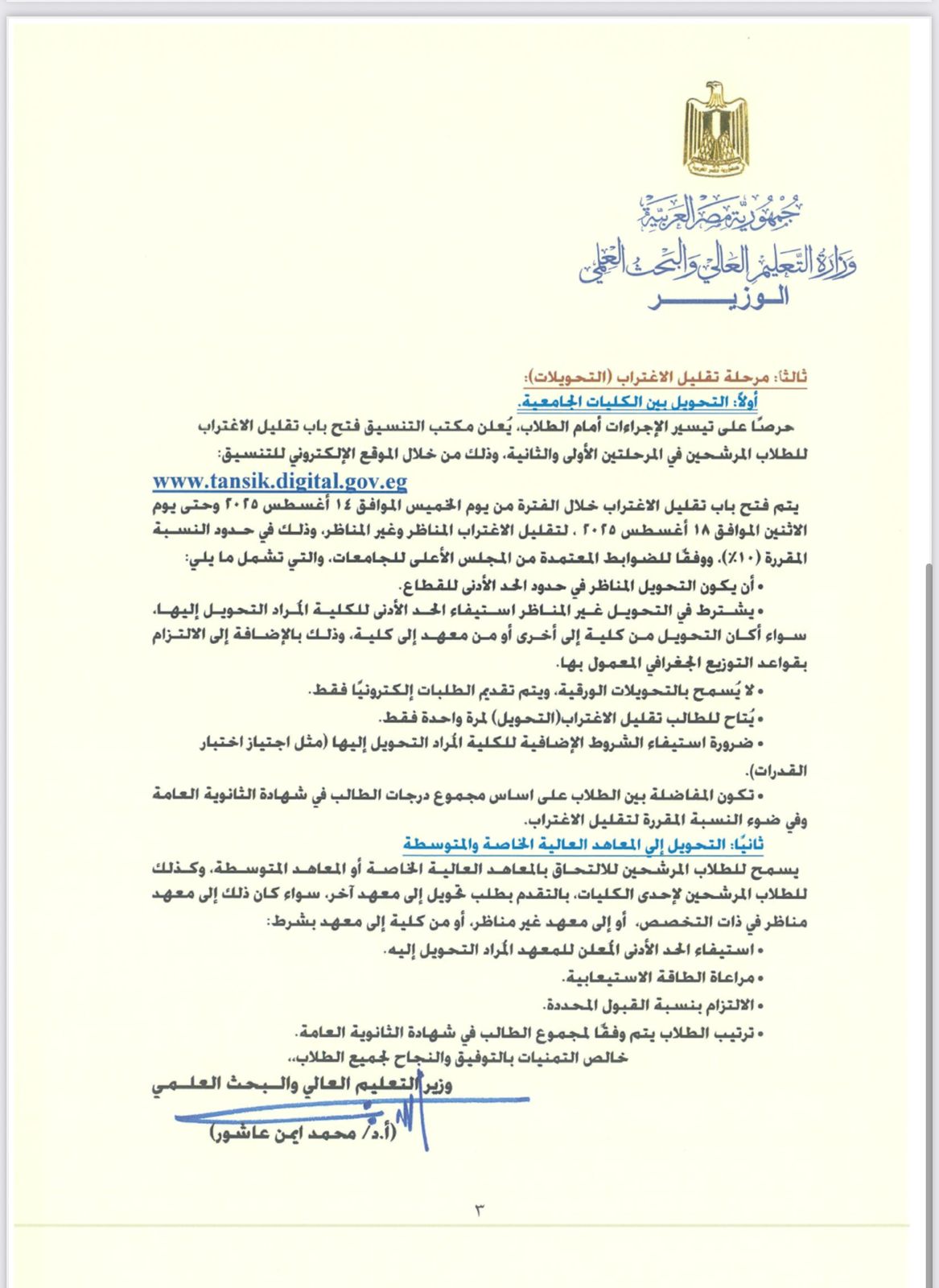 كما أشارت الوزارة إلى إمكانية انتقال الطالب من قطاع تخصص إلى آخر، شريطة الالتزام بالقواعد المحددة، مع ضرورة الانتباه لأسماء الأقسام والشعب المختلفة التي تعد كل منها رغبة مستقلة.
