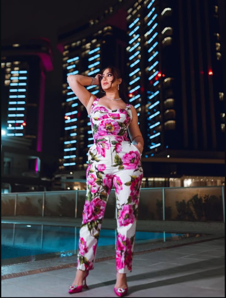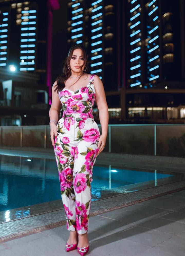 وكانت ترتدي جامبسوت باللون البينك والابيض،مكونة من قطعتين ملابس تجمع بين الجزء العلوي بلوزة،والسفلي بنطال كلاسيك،به الكثير من الورود وهيلز بينك،مع لوك شعر وميكب هادئ.