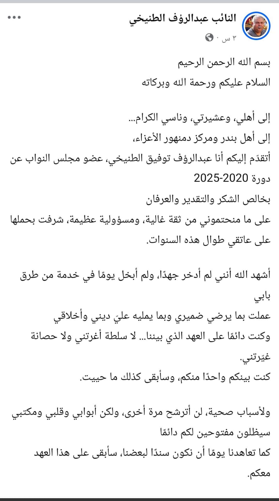 وأضاف النائب: "كنت بينكم واحدًا منكم وسأبقى كذلك، ورغم أنني لن أترشح مرة أخرى، فإن أبوابي وقلبي ومكتبي سيظلون مفتوحين دائمًا أمامكم، وأدعو الله أن يوفق من يحمل الراية من بعدي لما فيه الخير للبلد وأهلها".