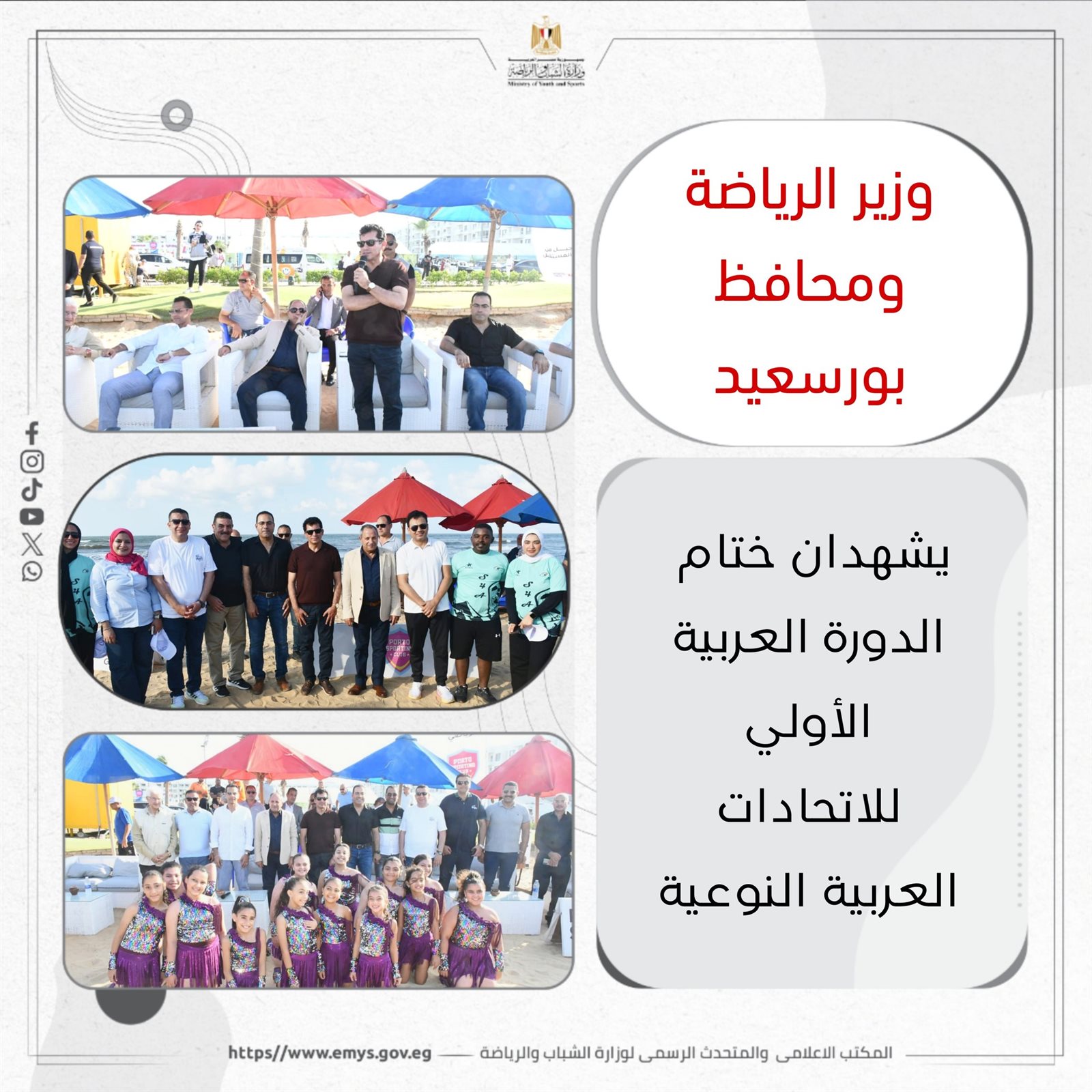 أطلق الدكتور أشرف صبحي وزير الشباب والرياضة، واللواء محب حبشي محافظ بورسعيد، والنائب محمود حسين عضو مجلس النواب ورئيس لجنة الشباب والرياضة، حمام السلام في سماء بورسعيد خلال حفل ختام فعاليات الدورة الرياضية العربية الأولى للاتحادات النوعية، والتي استضافتها المحافظة على مدار الأيام الماضية بمشاركة 10 دول عربية، في مشهد جسّد رسالة محبة وسلام من المدينة الباسلة إلى الأمة العربية.