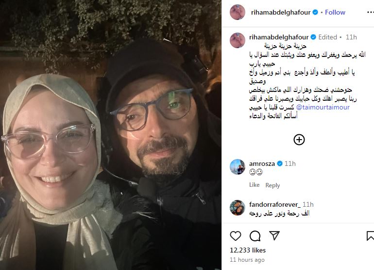 وكتبت ريهام عبد الغفور ناعية تيمور تيمور " حزينة حزينة حزينة الله يرحمك ويغفرلك ويعفو عنك ويثبتك عند السؤال يا حبيبي ياربيا أطيب وألطف وألذ وأجدع بني أدم وزميل وأخ وصديق حتوحشني ضحتك وهزارك اللي ماكنش بيخلص ربنا يصبر اهلك وكل حبايبك ويصبرنا علي فراقك كسرت قلبنا يا حبيبي أسألكم الفاتحة والدعاء".