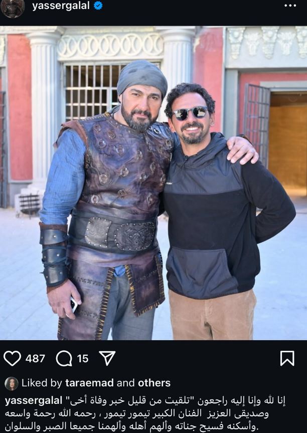 وكتب ياسر جلال عبر حسابه الشخصي بموقع إنستجرام: "إنا لله وإنا إليه راجعون “تلقيت من قليل خبر وفاة أخى وصديقى العزيز الفنان الكبير تيمور تيمور ، رحمه اللّٰه رحمة واسعه وأسكنه فسيح جناته وألهم أهله وألهمنا جميعا الصبر والسلوان”.