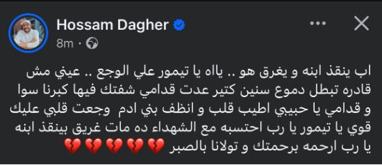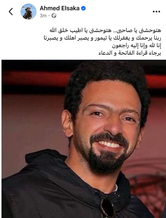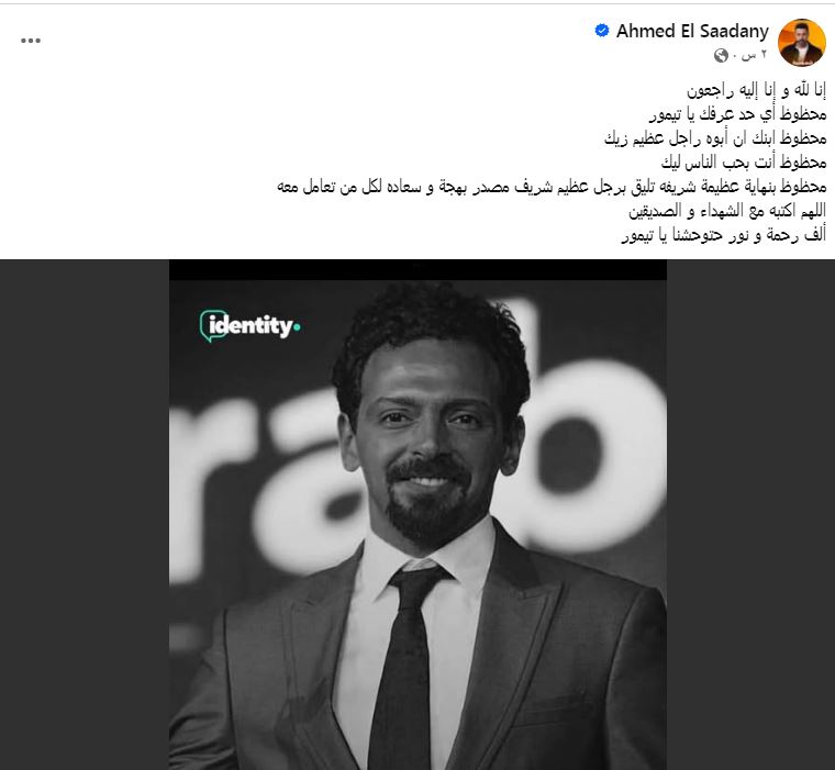 وكتب أحمد السقا عبر حسابه الشخصي "هتوحشني يا صاحبى، هتوحشنى يا اطيب خلق الله ربنا يرحمك و يغفرلك يا تيمور و يصبر اهلك و يصبرنا، إنا لله وإنا إليه راجعون، برجاء قراءة الفاتحة و الدعاء".