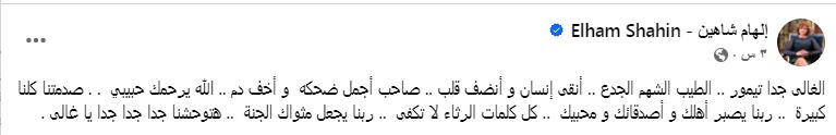بكلمات مؤثرة رثت النجمة إلهام شاهين الراحل تيمور تيمور والذي رحل عن عالمنا مساء أمس السبت وسط حالة من الحزن الشديد أصابت الوسط الفني لرحيله المفاجئ والبطولي أثناء محاولته إنقاذ ابنه من الغرق .