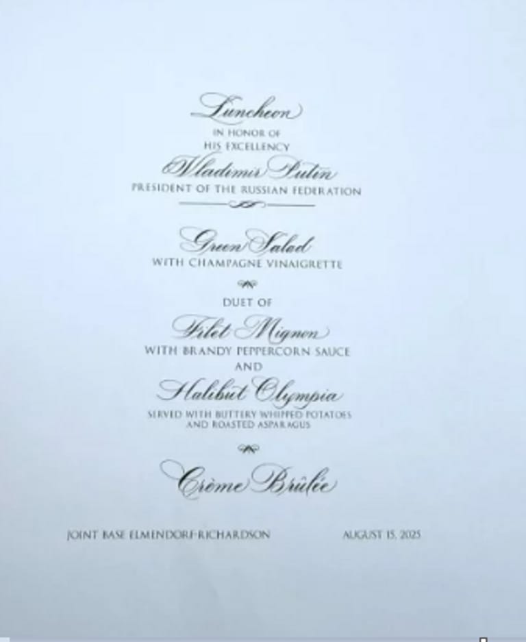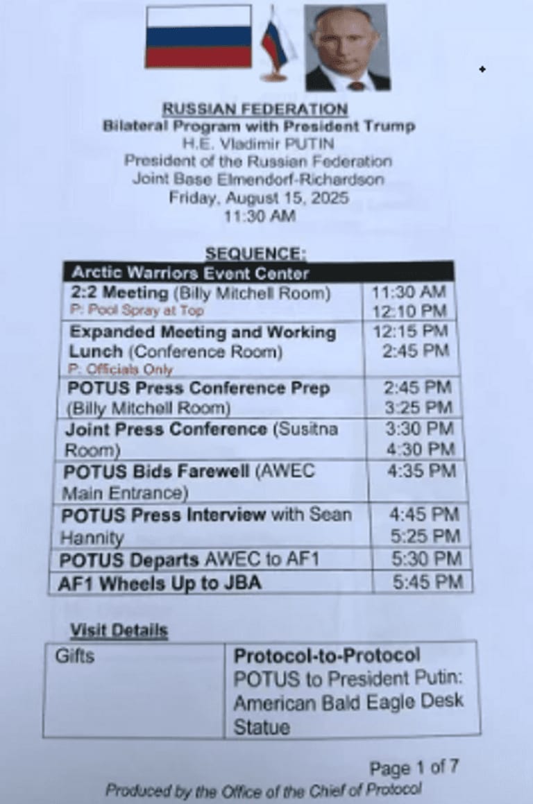 إلى جانب برنامج اللقاءات، تضمنت الأوراق أسماء وزراء ومسؤولين من البلدين مع تحديد أماكن جلوسهم، بينهم سيرغي لافروف وأنطون سيلوانوف بجانب بوتين، وماركو روبيو وسوزي وايلز إلى جوار ترامب.