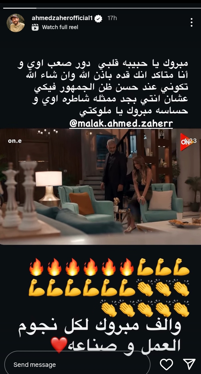 هنئ الفنان أحمد زاهر ابنته ملك زاهر بدورها في مسلسل أزمة ثقة، الذي من المقرر عرضه حصريًا يوم الأحد المقبل على شاشة قناة أون.