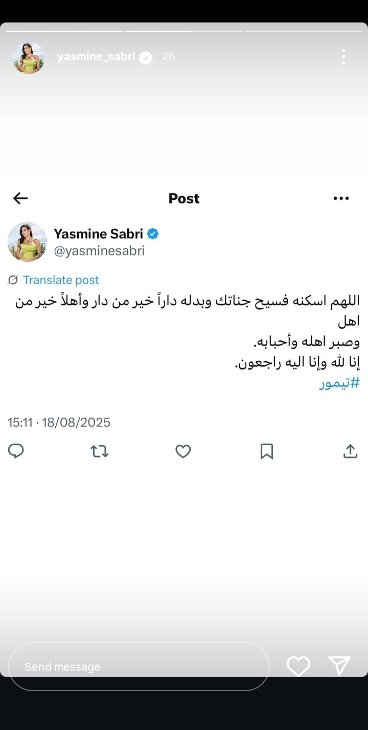 وكتبت ياسمين صبري من خلال حسابها الرسمي عبر موقع تبادل الصور والفيديوهات القصيرة "إنستجرام"، عبر خاصية استوري:" اللهم اسكنه فسيح جناتك وبدله دارًا خير من داره وأهلًا خيرًا من أهله وصبر أهله وأحبابه.. إنا لله وإنا اليه راجعون.. تيمور".