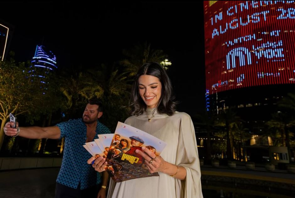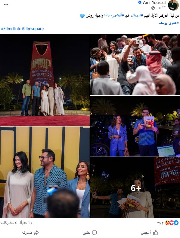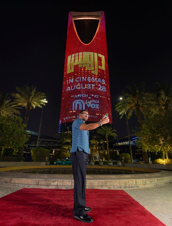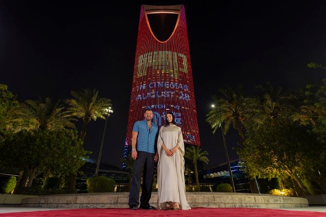 برج المملكة يضيء بصور فيلم "درويش" لـ"عمرو يوسف ودينا الشربيني" (صور)