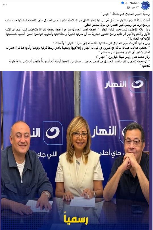 أعلنت شبكة تلفزيون النهار مساء أمس في بيان لها انضمام الإعلامية لميس الحديدي إلى شاشتها، لتقديم برنامج "توك شو" رئيسي كبير اعتباراً من نهاية سبتمبر المقبل.
