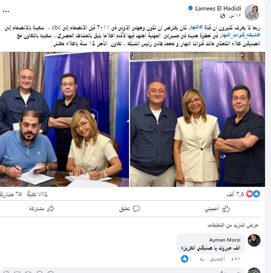 ومن جانبها أعربت لميس الحديدي عن سعادتها بالإنضمام إلى أسرة " النهار " وأضافت " تجمعني علاقات صداقة سابقة مع كثيرين من قيادات النهار و إعلامييها وسعيدة بالعمل وسط كوكبة نجومها وأتابع منذ فترة خطوات نجاح وتطور في النهار وطموح كبير يشجعني "