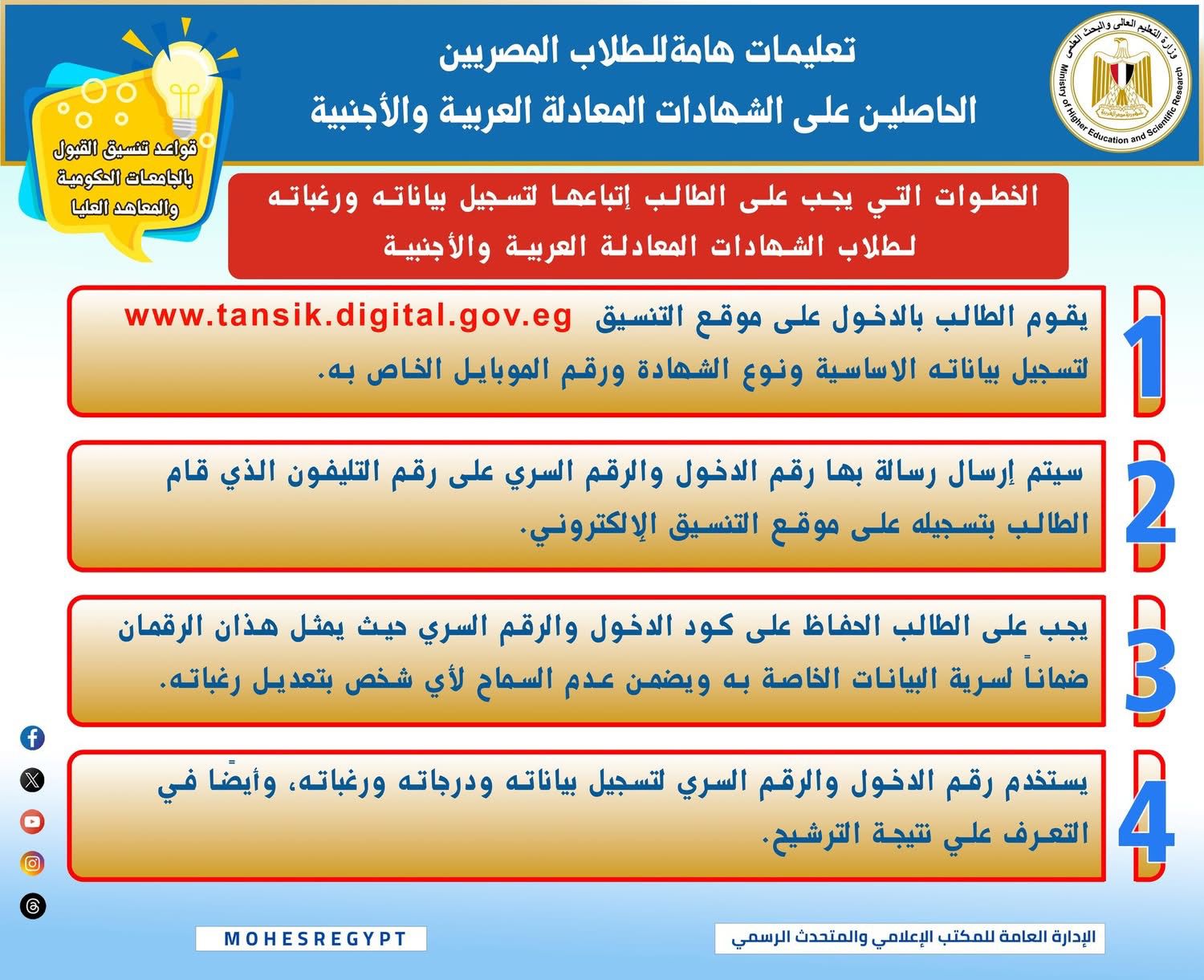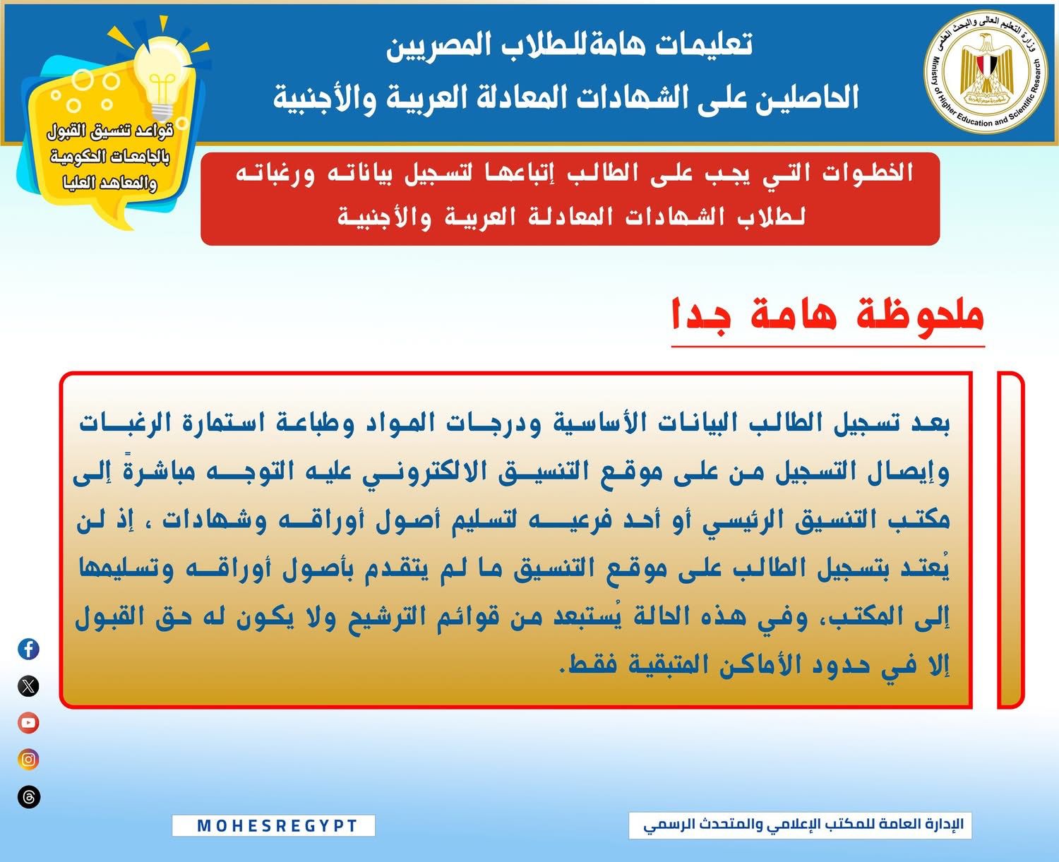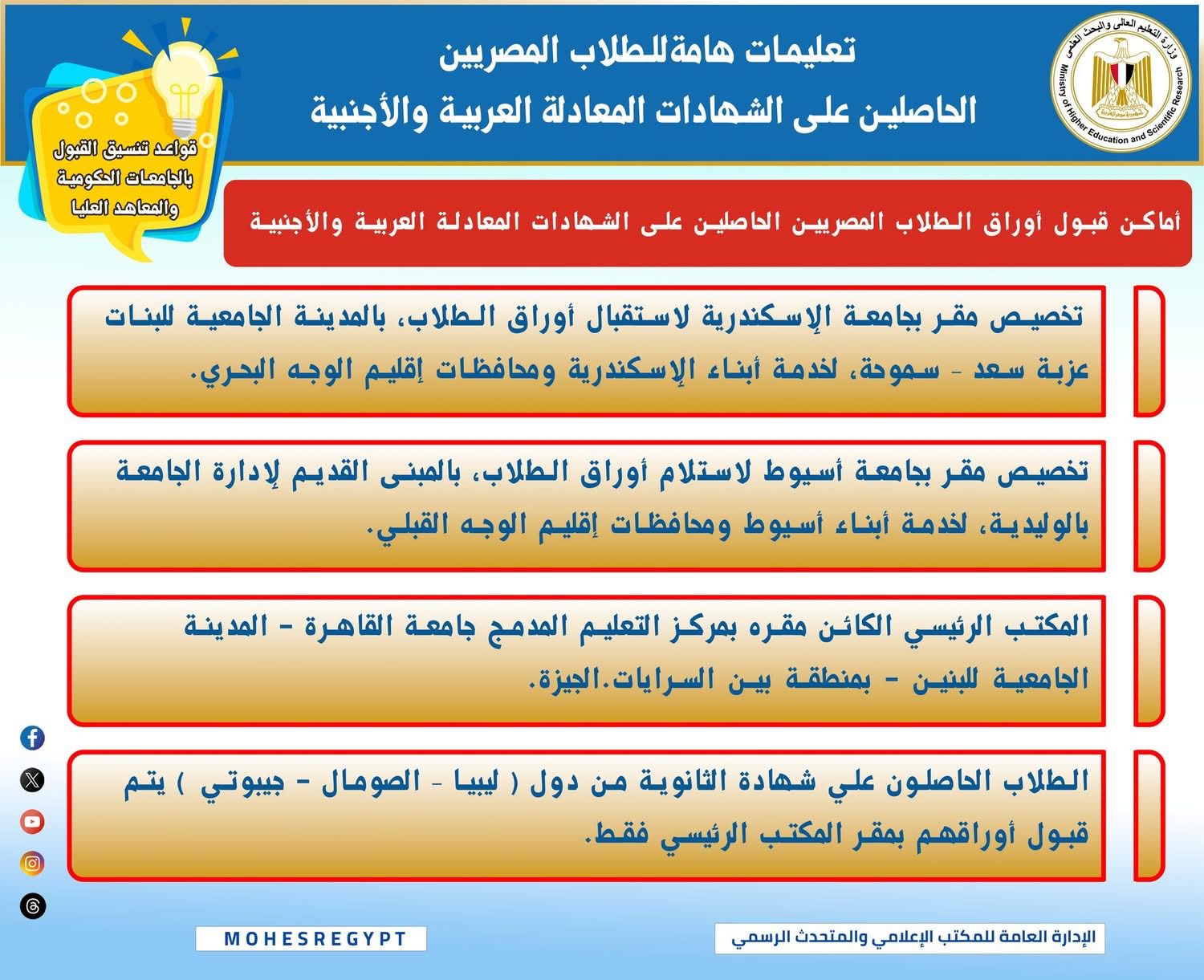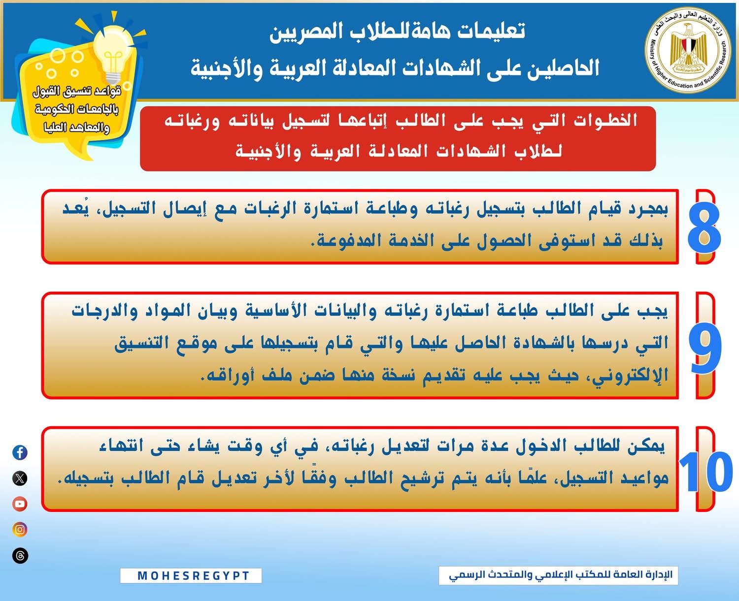 هذا، وسيتم نشر الأدلة الإرشادية وكافة الوسائل التوضيحية عبر الموقع الإلكتروني للوزارة والحسابات الرسمية لوزارة التعليم العالي والبحث العلمي على مواقع التواصل الاجتماعي