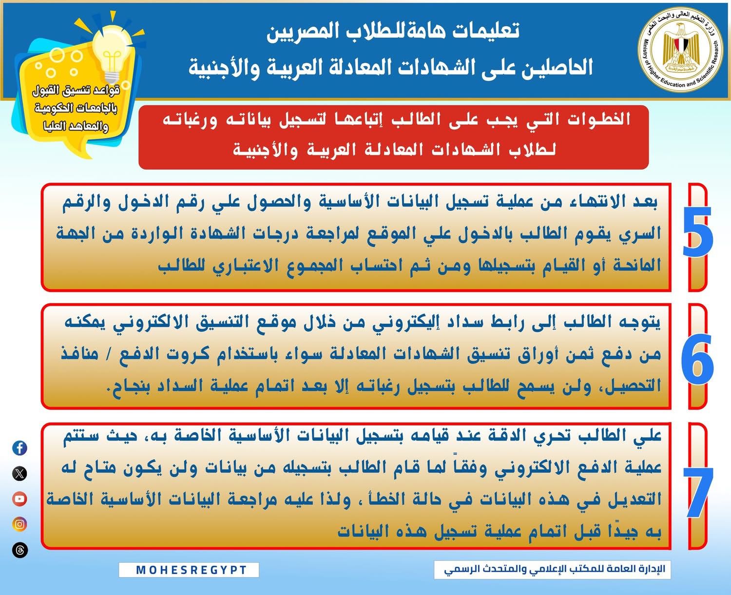 التعليم العالي تنشر أدلة إرشادية حول ضوابط تقديم الطلاب الحاصلين على الشهادات المعادلة لتنسيق الجامعات
