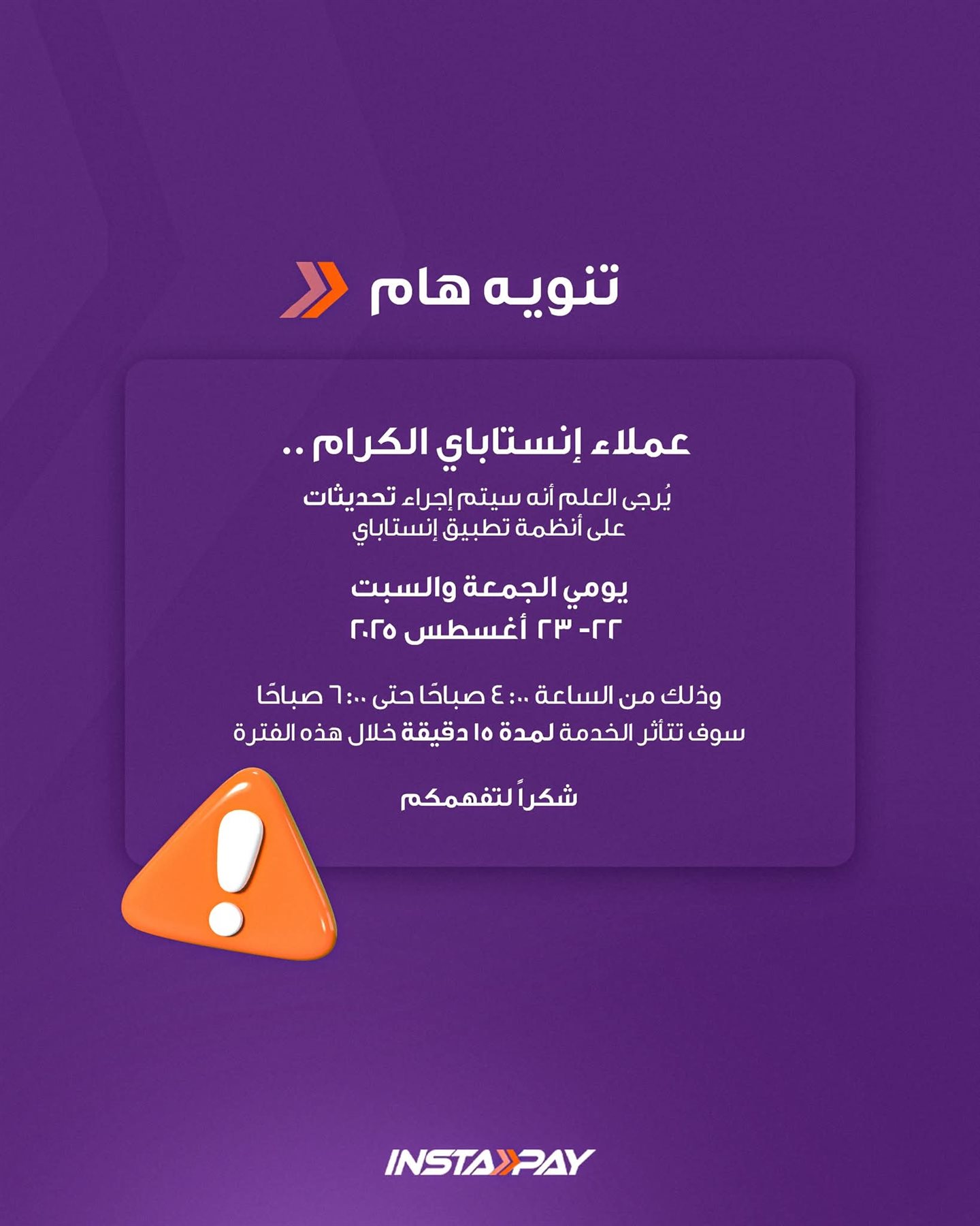 أعلنت شركة إنستاباي عن إجراء بعض التحديثات الدورية على أنظمة تطبيقها يومي الجمعة والسبت 22 و23 أغسطس 2025، وذلك في الفترة من الساعة 4:00 صباحًا حتى 6:00 صباحًا.