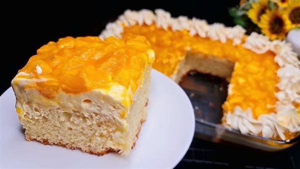 قومي بإضافة عصير المانجو على الكيك ويترك يتشرب