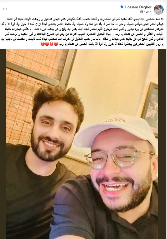 وأختتم"بهاء الجميل المحترم الطيب اعرفه من وهو في مسرح الجامعه و قبل المعهد و برضه كبر قدامي و كان ناجح في كل حاجه حتي مجاله و شغله الاساسي جمب التمثيل لو اعرف انك هتمشي فجاه كنت قابلتك و مفضلناش ناجلها ليه يا ربي الطيبين المحترمين بيمشوا فجاه لا حول ولا قوة الا بالله الصبر من عندك يا رب".