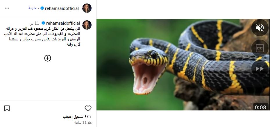 وكتبت ريهام عبر صفحتها الرسمية "إنستجرام"" اللي بيتعمل مع الفنان كريم محمود عبد العزيز و مراته المحترمه و الفيديوهات الي مش محترمه قمه قله الأدب الريتش و الترند بقت ثعابين بتخرب حياتنا و سمعتنا لازم وقفه".
