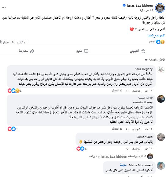 وكتبت عز عبر صفحتها الرسمية "فيس بوك" "غلطة راجل باختيار زوجة تانية رخيصة كلفته عمره و عمر ٦ أطفال و دخلت زوجته أم الأطفال مستشفى الأمراض العقلية بعد قهرتها على كل عيالها و جوزها ،قلبي واجعني من الخبر ده".