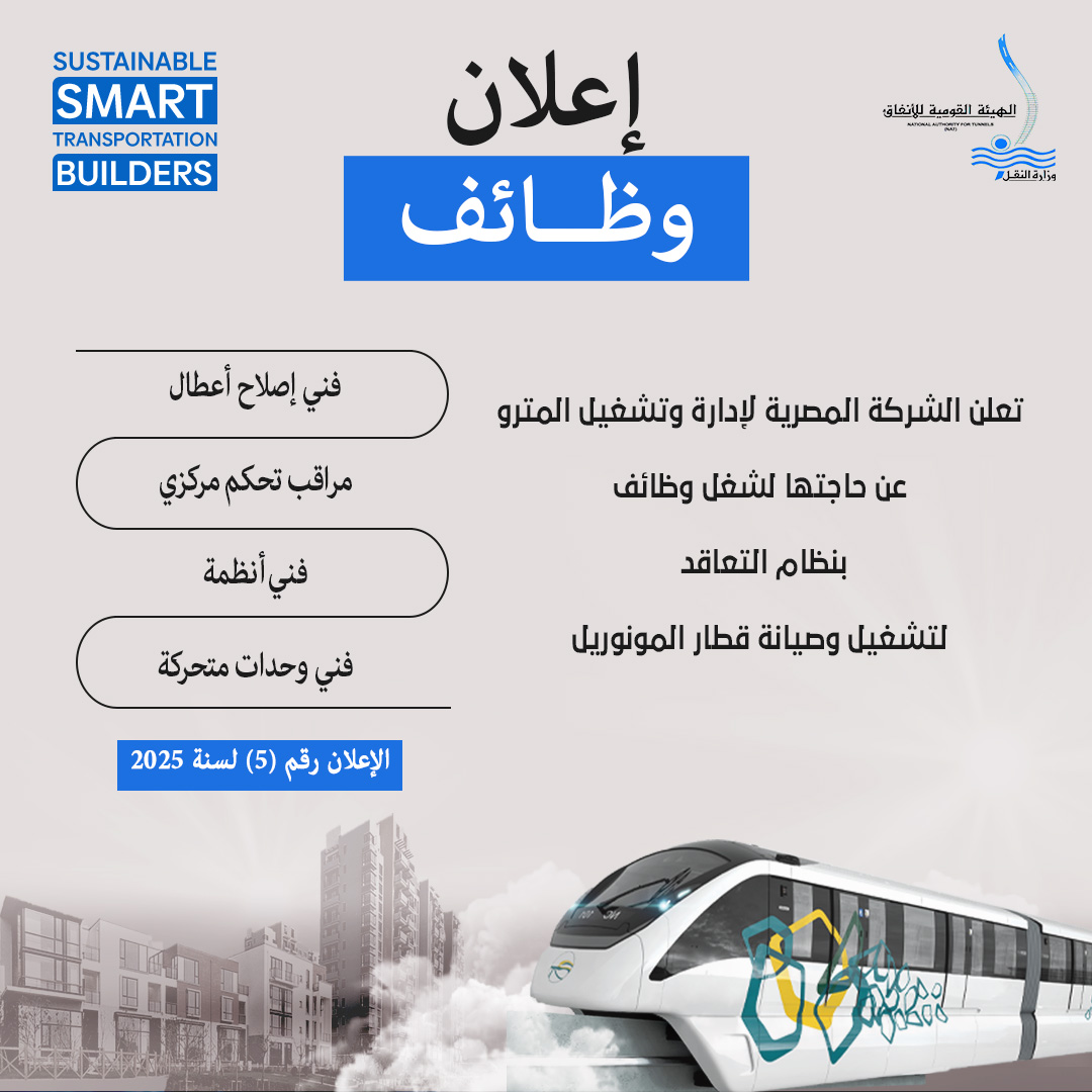 وظائف تشغيل وصيانة قطار المونوريل 2025.. أعلنت الشركة المصرية لإدارة وتشغيل المترو (E.C.M) عن فتح باب التقديم لشغل عدد من الوظائف بنظام التعاقد للعمل في مجال تشغيل وصيانة قطار المونوريل، في إطار تطوير منظومة النقل الجماعي وتحسين خدمات المترو في القاهرة.