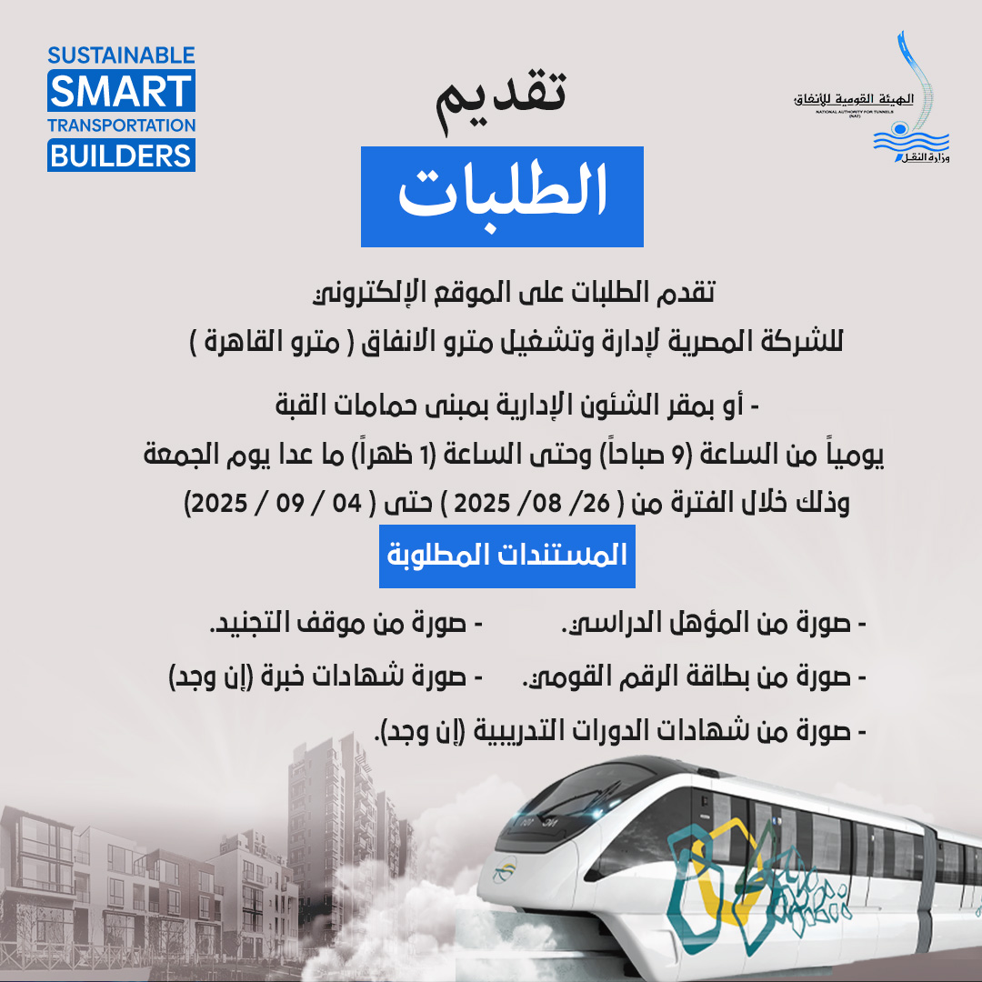 وأوضحت الشركة أن التقديم متاح عبر الموقع الإلكتروني الرسمي الخاص بالشركة، وذلك من خلال الرابط التالي: https://www.cairometro.gov.eg/ar/jobs.