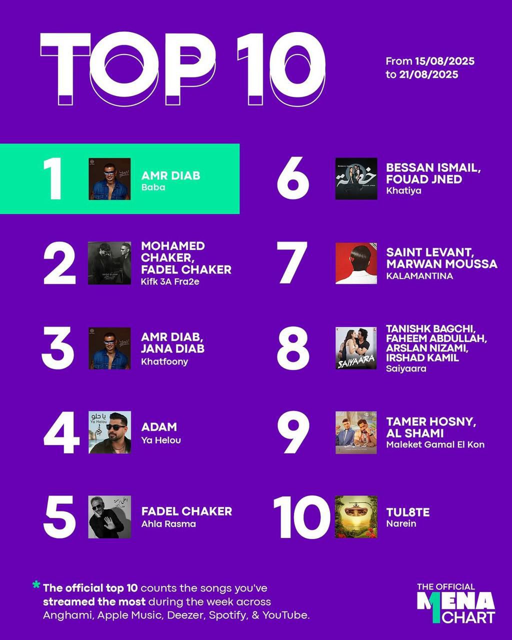 تصدر النجم الكبير عمرو دياب فائمة "مينا تشارت" للفنانين الأعلى استماعا في الشرق الأوسط لهذا الأسبوع.