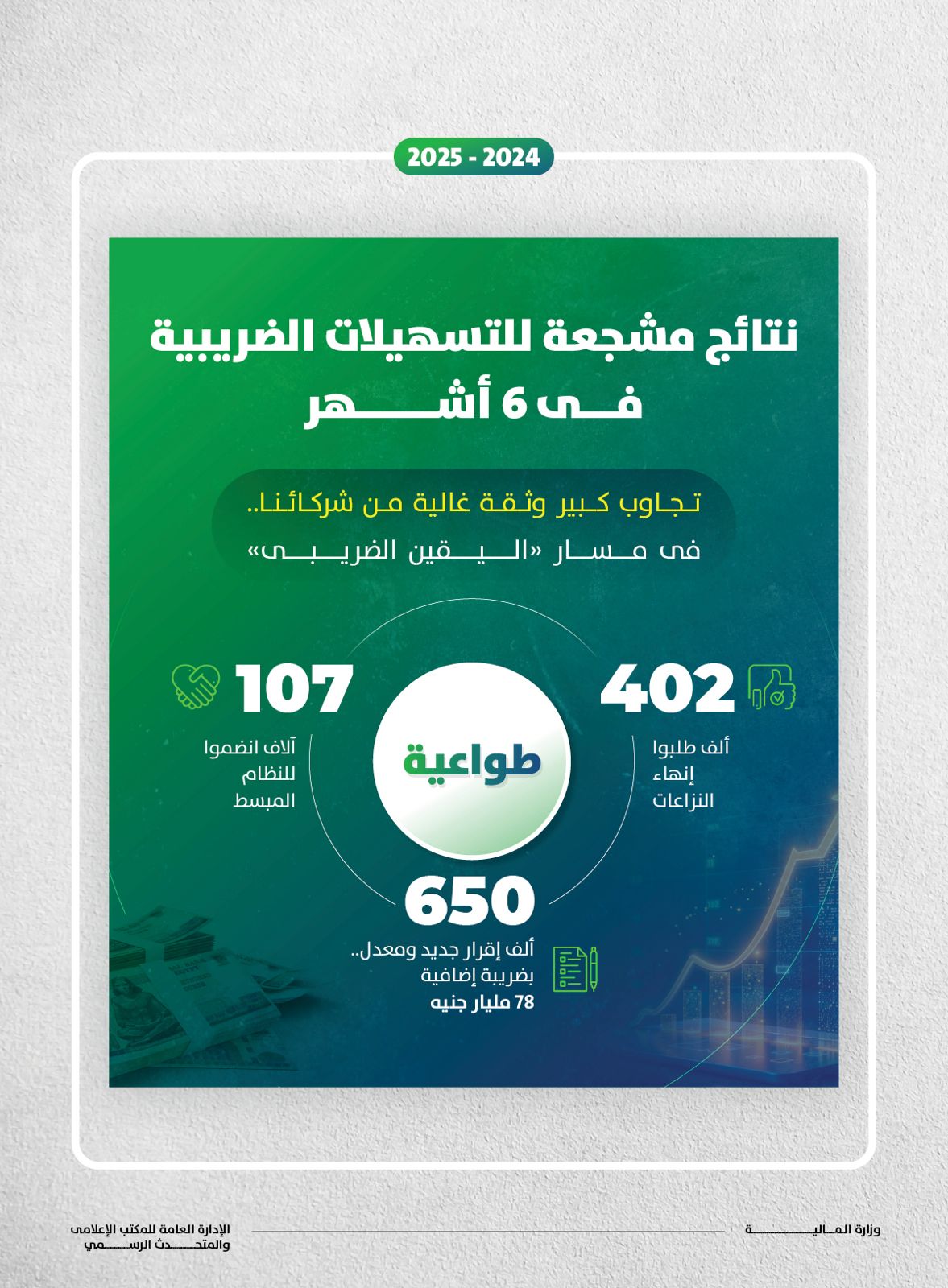 أضاف الوزير، أن نتائج حزمة التسهيلات الضريبية فى ٦ أشهر جاءت مشجعة، مما يدفعنا لاستكمال المشوار وإطلاق حزم متتالية من التيسيرات، موضحًا أن نحو ٤٠٢ ألف طلبوا إنهاء النزاعات الضريبية و١٠٧ آلاف انضموا للنظام المبسط طواعية حتى الآن، وتم تقديم نحو ٦٥٠ ألف إقرار جديد ومعدل بضريبة إضافية بقيمة ٧٨ مليار جنيه «طواعية».