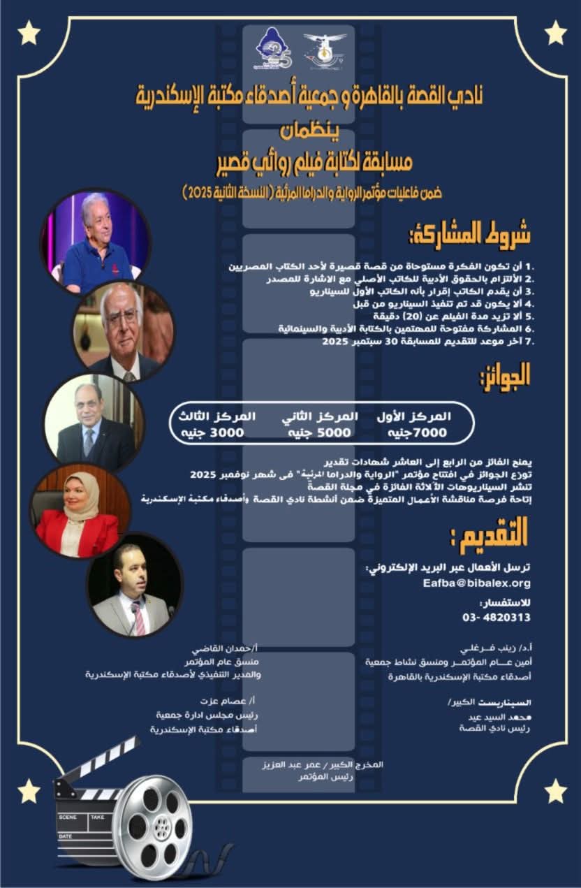 أعلن نادي القصة بالقاهرة، برئاسة الكاتب والسيناريست محمد السيد عيد، وجمعية أصدقاء مكتبة الإسكندرية، عن تنظيم مسابقة لكتابة فيلم روائي قصير، وذلك ضمن فعاليات مؤتمر الرواية والدراما المرئية (النسخة الثانية 2025).