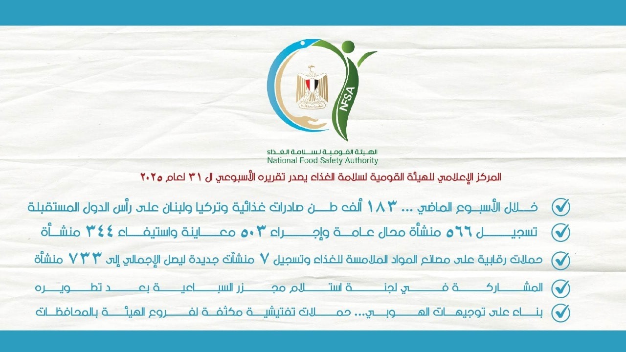 أصدر المركز الإعلامي للهيئة القومية لسلامة الغذاء تقريره الأسبوعي الـ 31 لعام 2025، وذلك عن الفترة من 23 – 29 أغسطس، والذي تضمن العديد من الأنشطة المختلفة على النحو التالي: