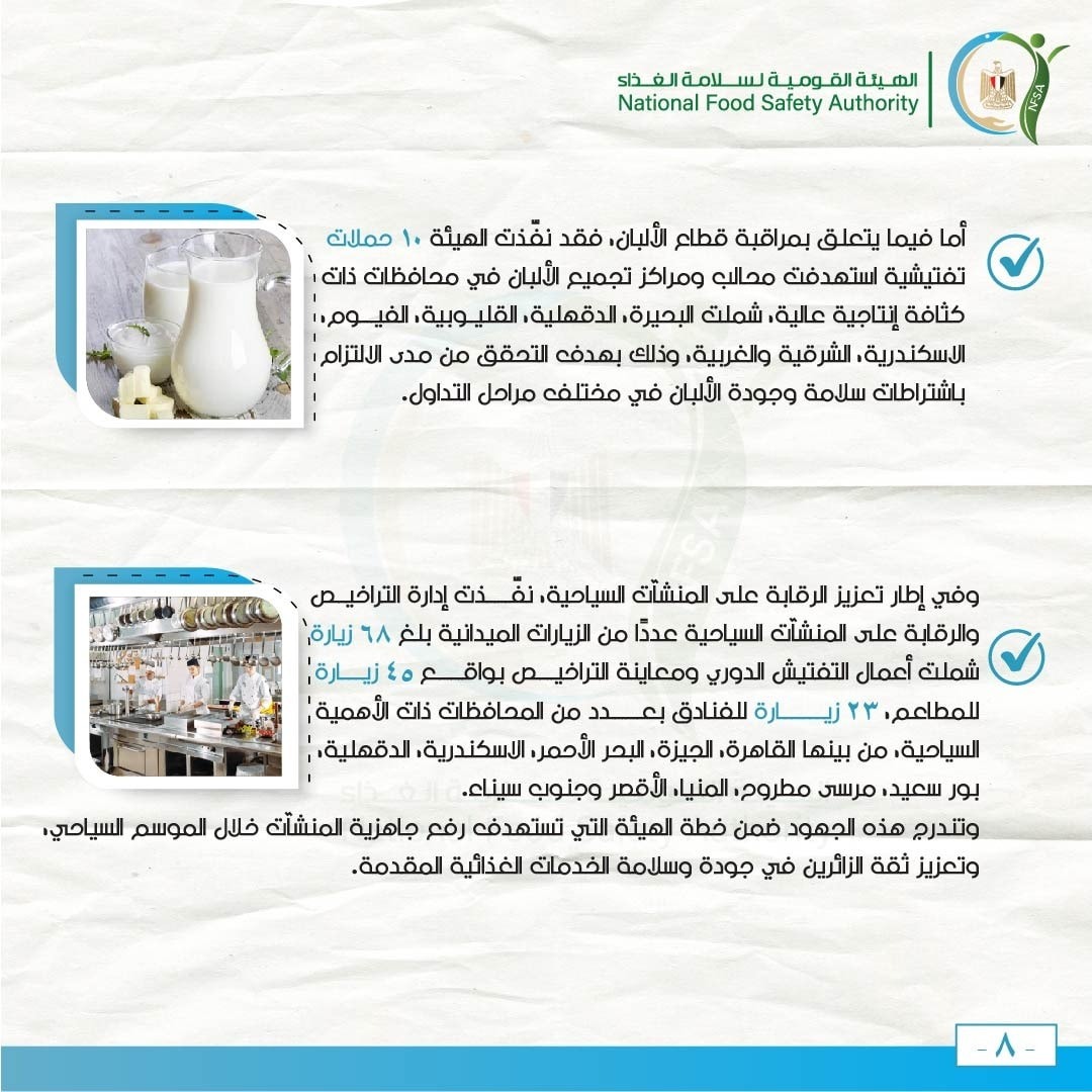 أما فيما يتعلق بمراقبة قطاع الألبان، فقد نفّذت الهيئة 10 حملات تفتيشية استهدفت محالب ومراكز تجميع الألبان في محافظات ذات كثافة إنتاجية عالية، شملت البحيرة، الدقهلية، القليوبية، الفيوم، الاسكندرية، الشرقية والغربية، وذلك بهدف التحقق من مدى الالتزام باشتراطات سلامة وجودة الألبان في مختلف مراحل التداول.