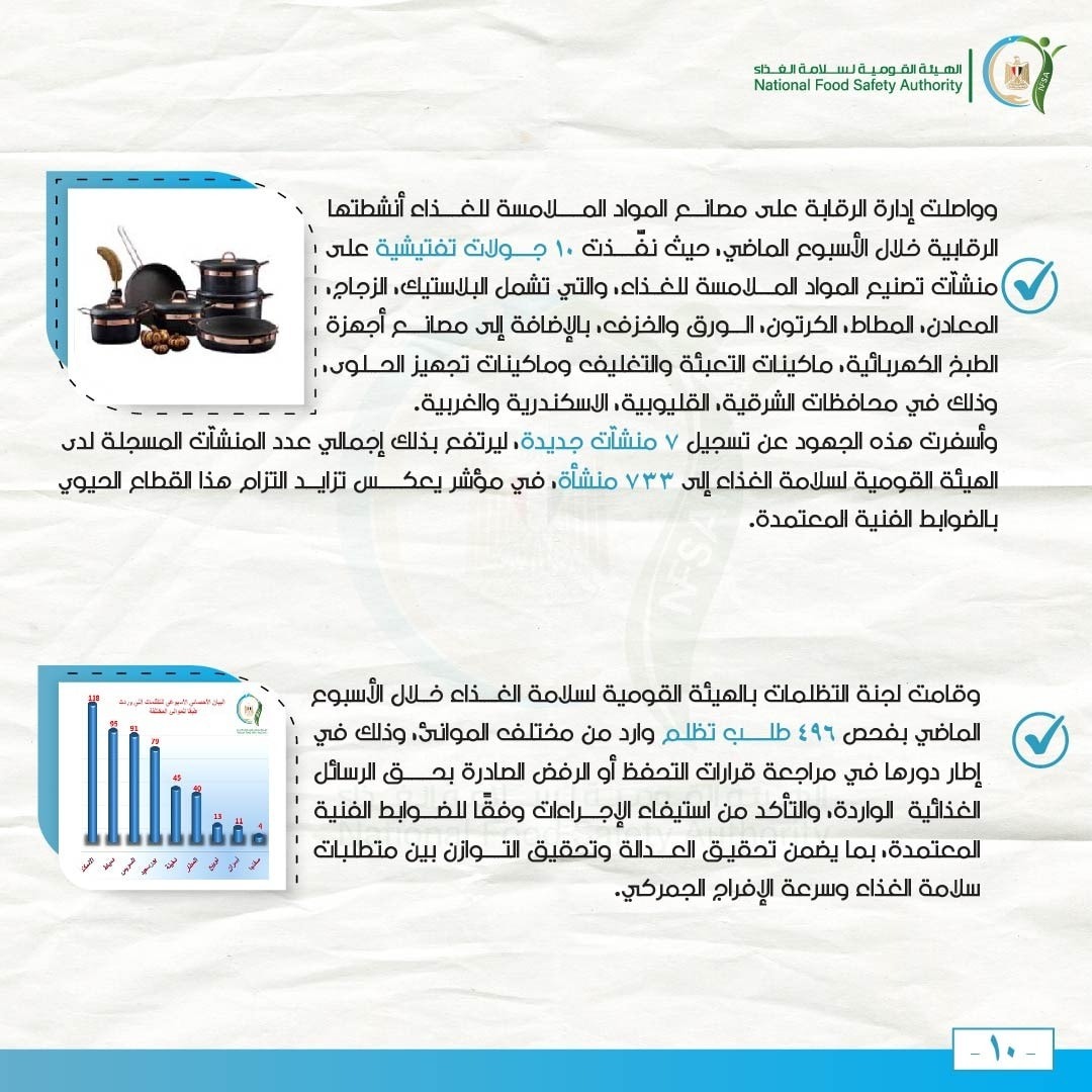 وواصلت إدارة الرقابة على مصانع المواد الملامسة للغذاء أنشطتها الرقابية خلال الأسبوع الماضي، حيث نفّذت 10 جولات تفتيشية على منشآت تصنيع المواد الملامسة للغذاء، والتي تشمل البلاستيك، الزجاج، المعادن، المطاط، الكرتون، الورق والخزف، بالإضافة إلى مصانع أجهزة الطبخ الكهربائية، ماكينات التعبئة والتغليف وماكينات تجهيز الحلوى، وذلك في محافظات الشرقية، القليوبية، الاسكندرية والغربية.