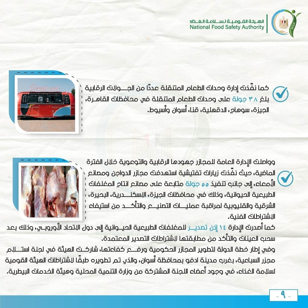 كما نفّذت إدارة وحدات الطعام المتنقلة عددًا من الجولات الرقابية بلغ 38 جولة على وحدات الطعام المتنقلة في محافظات القاهرة، الجيزة، سوهاج، الدقهلية، قنا، أسوان وأسيوط.