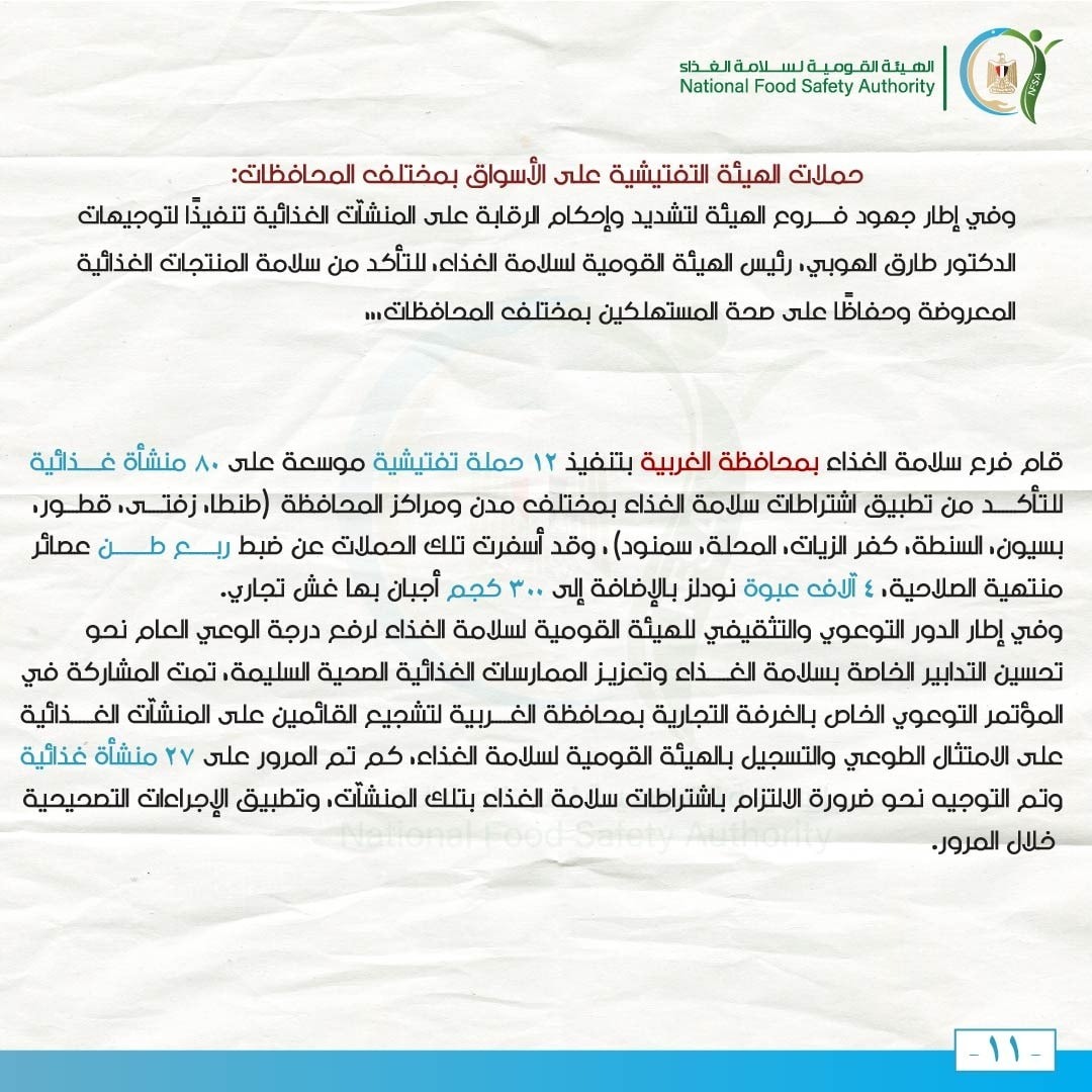 وفي إطار الدور التوعوي والتثقيفي للهيئة القومية لسلامة الغذاء لرفع درجة الوعي العام نحو تحسين التدابير الخاصة بسلامة الغذاء وتعزيز الممارسات الغذائية الصحية السليمة، تمت المشاركة في المؤتمر التوعوي الخاص بالغرفة التجارية بمحافظة الغربية لتشجيع القائمين على المنشآت الغذائية على الامتثال الطوعي والتسجيل بالهيئة القومية لسلامة الغذاء، كم تم المرور على 27 منشأة غذائية وتم التوجيه نحو ضرورة الالتزام باشتراطات سلامة الغذاء بتلك المنشآت، وتطبيق الإجراءات التصحيحية خلال المرور.