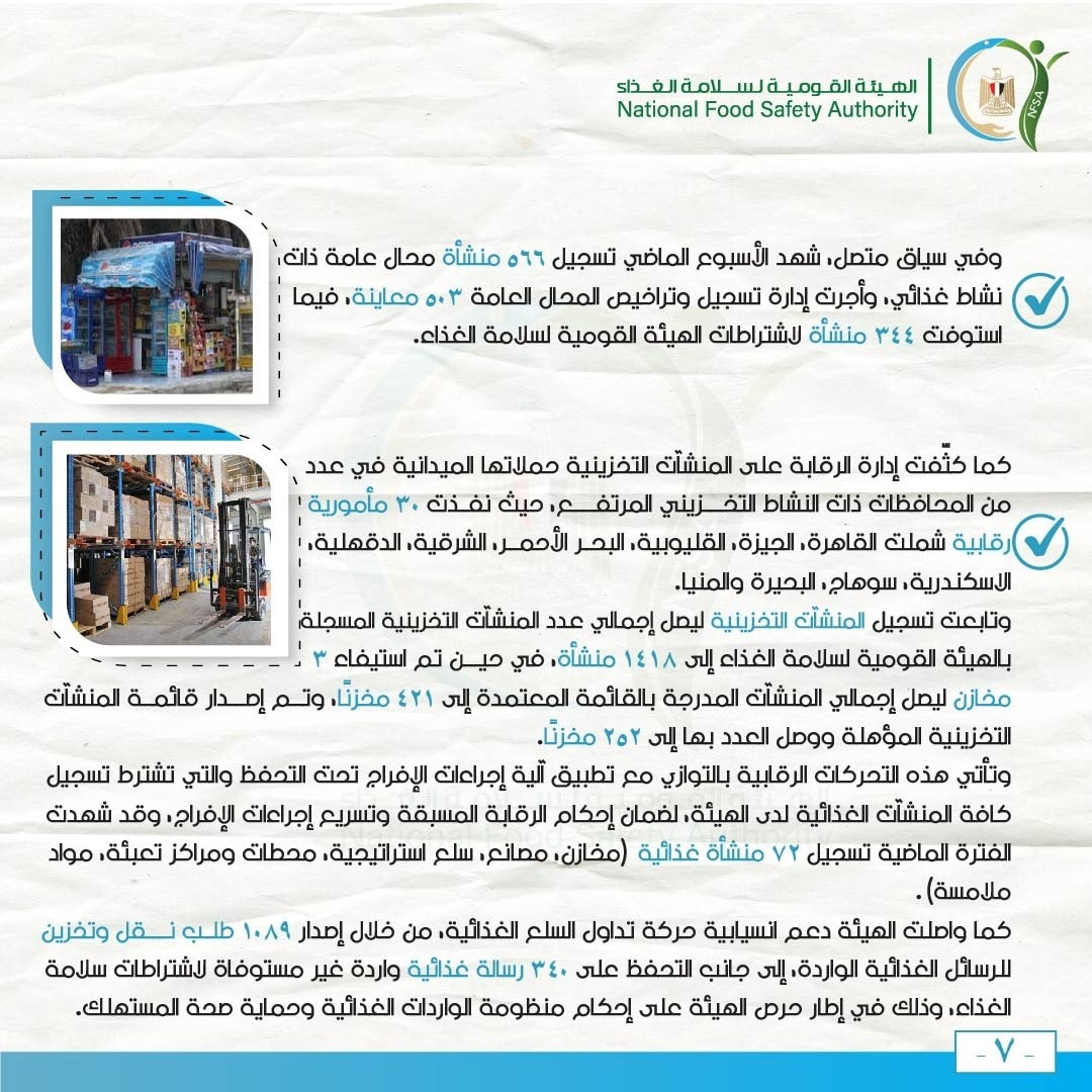 وفي سياق متصل، شهد الأسبوع الماضي تسجيل 566 منشأة محال عامة ذات نشاط غذائي، وأجرت إدارة تسجيل وتراخيص المحال العامة 503 معاينة، فيما استوفت 344 منشأة لاشتراطات الهيئة القومية لسلامة الغذاء.