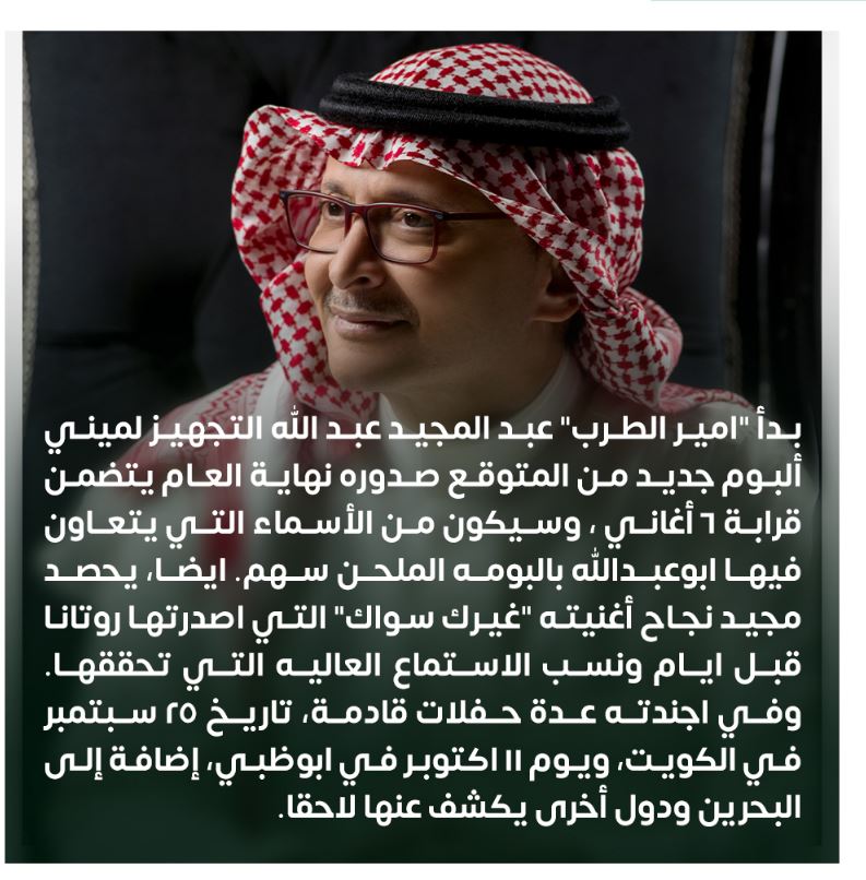 ونشر الحساب الرسمي لـ روتانا موسيقي عبر منصة "‘إكس" تويتر سابقآ تفاصيل الألبوم وكتبت" بدأ أمير الطرب عبد المجيد عبدالله ، التجهيز لميني ألبوم جديد ، من المتوقع صدوره نهاية العام ويتضمن قرابة 6 أغاني وسيكون من الأسماء التي يتعاون فيها ، الألبوم الملحن سهم .