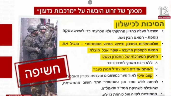 الوثيقة، التي حمل سيجال عنوان "وثيقة من فرع هيفشاه حول "مركبات جدعون"، سرد أسباب "فشل الجيش" في العملية والأسباب التي أدت إليها، وجاء فيها: "تصرفت إسرائيل بمنطق الردع، لا بالحزم، للتوصل إلى اتفاق آخر - وأدركت حماس ذلك". ووفقًا للوثيقة، فإن حملة التجويع التي شنتها حماس كانت زائفة، لكنها وُصفت هناك بأنها "ناجحة"، إلى جانب "سوء التخطيط والتنفيذ للمساعدات الإنسانية".