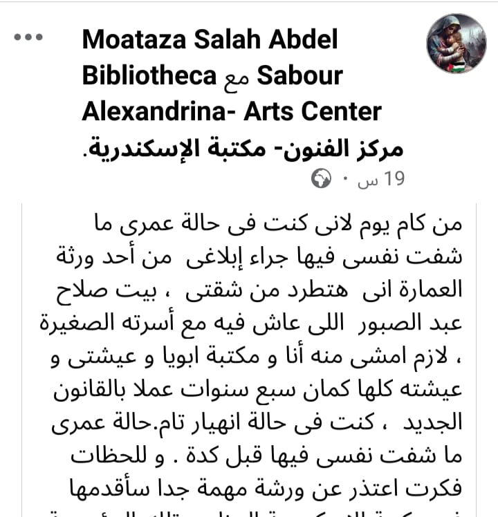 وأضافت "بيت صلاح عبد الصبور اللى عاش فيه مع أسرته الصغيرة ، لازم امشى منه أنا و مكتبة ابويا و عيشتى و عيشته كلها كمان سبع سنوات عملا بالقانون الجديد".