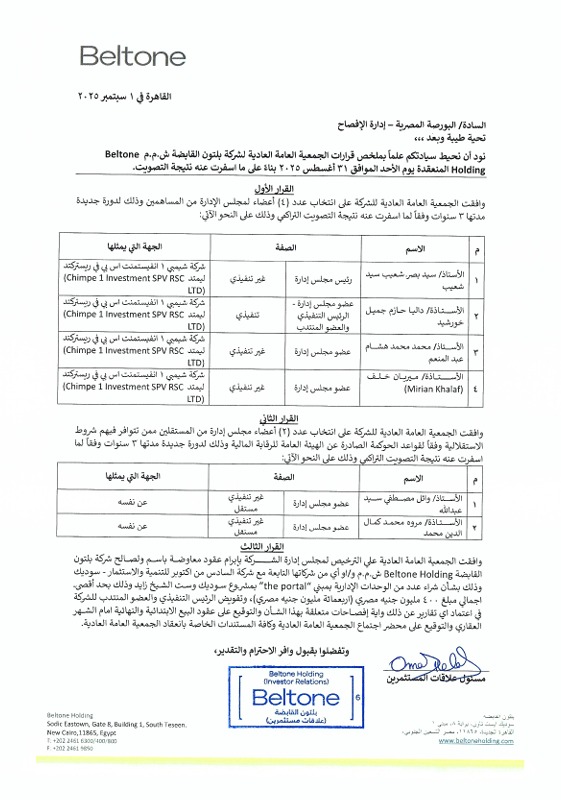شهدت الجمعية العامة العادية لشركة بلتون القابضة أعلى نسبة حضور وتصويت في تاريخ الشركة، وذلك بمشاركة حوالي ٨٨٪ ممن لهم حق التصويت، حيث وافقت الجمعية العامة بنسبة ٩٩.٩٪ على تجديد انتخاب مجلس الإدارة وتجديد تعيين السيدة/ داليا خورشيد عضوًا منتدبًا ورئيسًا تنفيذيًا للشركة لثلاثة أعوام إضافية.