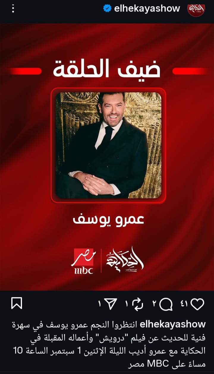 وأعلنت الصفحة الرسمية ببرنامج "الحكاية"،عبر موقع تبادل الصور والفيديوهات القصيرة"انستجرام"،عن موعد الحلقة قائلة:"انتظروا النجم عمرو يوسف في سهرة فنية للحديث عن فيلم "درويش" وأعمالة المقبلة في الحكاية مع عمرو أديب الليلة الإثنين 1 سبتمبر الساعة 10 مساءً على MBC مصر".