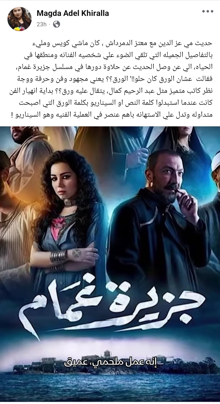 وعلقت ماجدة خير الله على هذه التصريحات، وكتبت من خلال حسابها الرسمي عبر موقع التواصل الاجتماعي فيسبوك، قالت: "حديث مي عز الدين مع معتز الدمرداش ، كان ماشي كويس ومليء بالتفاصيل الجميله التي تلقي الضوء علي شخصيه الفنانه ومنطقها في الحياه، الي عن وصل الحديث عن حلاوة دورها في مسلسل جزيرة غمام، فقالت عشان الورق كان حلو!!' الورق؟؟".